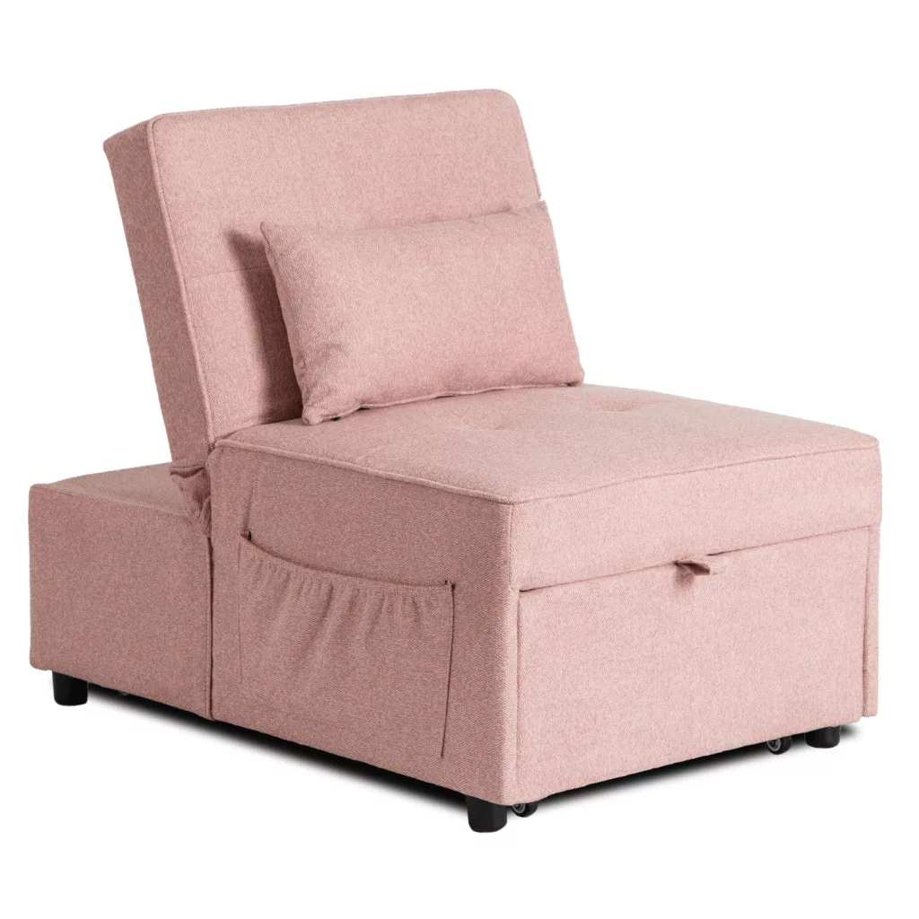 IBERIS 67 cm-es Rózsaszín Dönthető Fotel Néha egyetlen puha érintés is elég ahhoz, hogy egy belső tér teljes hangulatát átalakítsa. Az Iberis rózsaszín fotel nemcsak otthonosságot kölcsönöz egy térnek, hanem mindenekelőtt olyasmit kínál, amire igazán szüksége van egy mozgalmas nap után – egy pillanatnyi pihenést. Kompakt kialakítása (mindössze 67 cm széles) rengeteg kényelmet és funkcionalitást rejt, amit minden nap értékelni fog. Finom, mégis karakteres – tökéletes nappaliba, tinédzser szobába, olvasósarokba, dolgozószobába, vagy akár egy gyerek mesevilágba is. Miért válassza? 3 funkció egyben: Másodpercek alatt átalakíthatja a fotelt nyugágyá vagy vészhelyzeti ággyá. Könnyedén, kompromisszumok nélkül. Zseb a legszükségesebb dolgoknak: Minden, amire szüksége van, mindig kéznél van. A távirányítónak, a könyvnek vagy a töltőnek mind megvan a maga helye. Állítható háttámla és puha párna: Állítsa be a beállítást a hangulatához. Olvasás, pihenés, szunyókálás? Ön választ. Tartós anyag