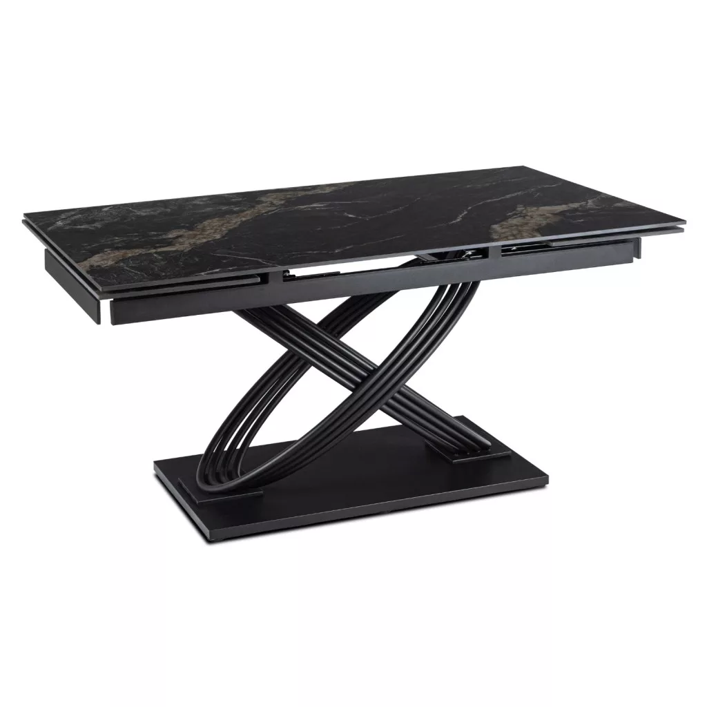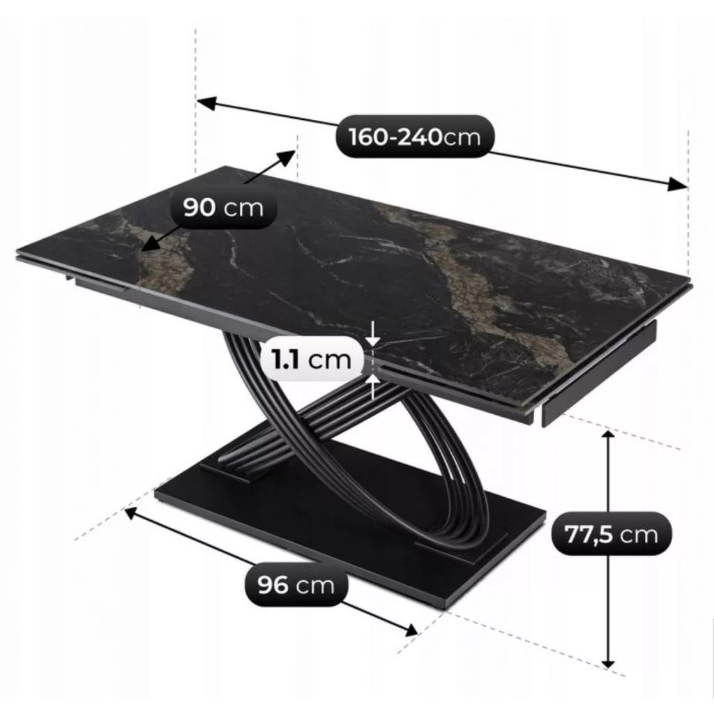 IBIZA Fekete Kerámia Kihúzható Asztal. Hozza be otthonába az Ibiza kihúzható asztalt, és tegye étkezője vagy nappalija igazi központi elemévé. Dinamikus életstílust szem előtt tartva tervezték, így bármilyen alkalomra tökéletes – a mindennapi étkezésektől a hivatalos összejövetelekig. Fedezze fel a képességeit. Mi teszi különlegessé? Fekete márvány színű, szinterezett kvarc asztallap – ellenáll a karcolásoknak, a hőnek és a nedvességnek, mégis hihetetlenül elegáns. Könnyen tisztítható – egy nedves ruhával visszaállíthatja fényét. Antibakteriális felület – a szinterezett szinterezett anyag nem szívja magába a szagokat és a zsírt, így higiénikus és friss megjelenést biztosít. A fémkeret nemcsak stabilitást garantál, hanem könnyed, modern jelleget is kölcsönöz. A keresztező lábak szemet gyönyörködtetőek és hangsúlyozzák a bútor egyedi dizájnját. Az Ibiza asztal az Ön igényeivel együtt bővíthető. Az egyszerű hosszabbító mechanizmusnak köszönhetően néhány pillanat alatt 160 cm-ről 240 cm-re növelheti a hosszát. Két diszkréten elrejtett betét simán csúszik a vezetősíneken az asztallap két oldalán, így akár 12 fő kényelmesen elfér benne. Tökéletes megoldás nagyobb családi összejövetelekre, nyaralásokra és elegáns partikra. Luxus az enteriőrben: A fekete márvány színű szinterezett kvarc asztallap egyedi eleganciát kölcsönöz az asztalnak, amely bármely tér tekintélyét emeli. Univerzális formája alkalmassá teszi mind a modern loftokba, mind a klasszikus, exkluzív enteriőrökbe. Ez a bútordarab nemcsak megkönnyíti az életet, hanem feldobja a szobát is. Hagyd, hogy az Ibiza asztal tanúja legyen a legszebb pillanataidnak.