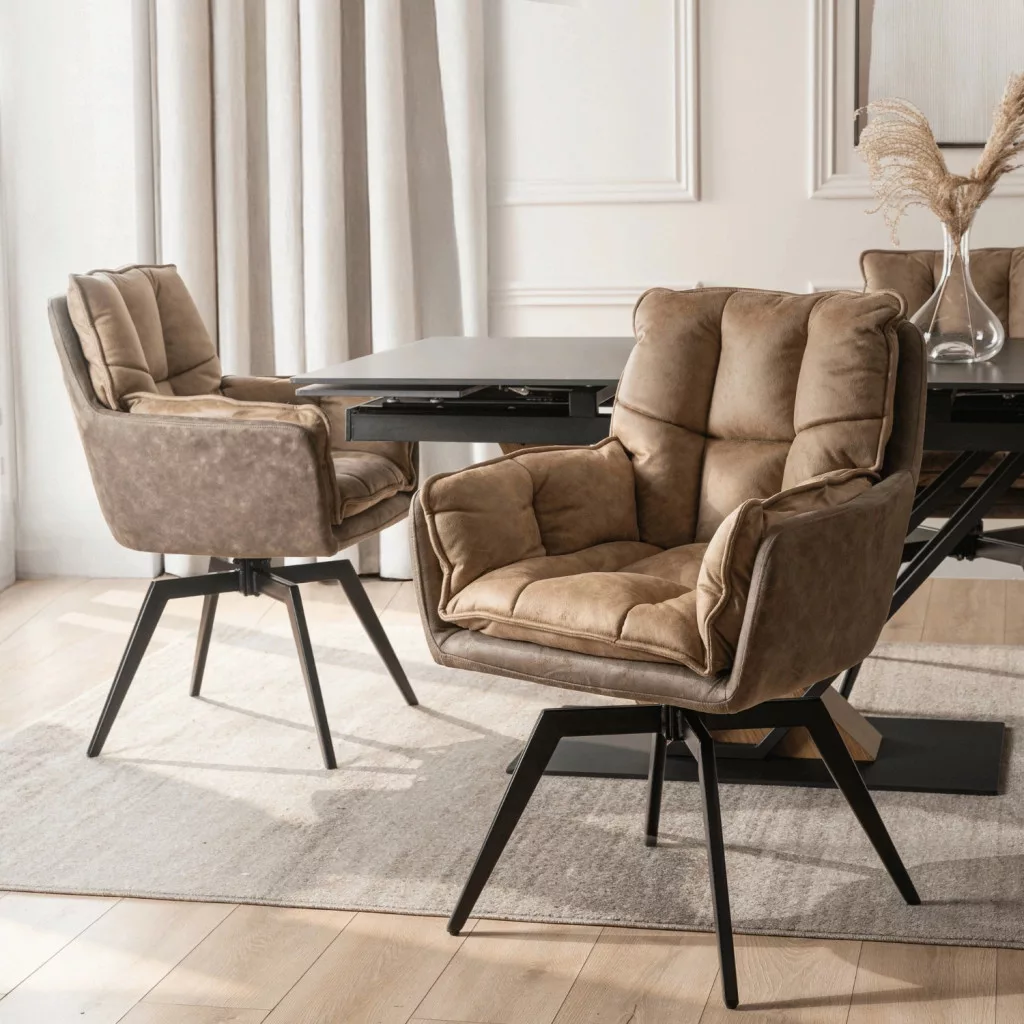 ISLA Forgószék barna színben. Kényelmes, mégis stílusos széket keres, amely kiemelkedik otthonából? A barna Isla modell modern dizájnjával és kontrasztos kétszínű kárpitozásával kápráztat el. Tökéletesen mutat étkezőben, nappaliban vagy modern tetőtérben. Miért válassza az Isla modellt? Bársony anyag – puha, kellemes tapintású és könnyen tisztítható. Ellenáll a bolyhosodásnak és a kopásnak. Tökéletes gyermekes vagy háziállatos otthonokba. 90°-os forgatási funkció – a praktikus mechanizmus növeli a kényelmet, megkönnyítve az asztaltól való felállást és a szék mindennapi használatát. Vastag, kényelmes ülés – a tömör párnázás támogatja a helyes testtartást, és még nagy igénybevétel esetén is megtartja formáját. Beépített párna – a puha, beépített párna enyhén lekerekített szélekkel fokozza az ülés kényelmét és hangsúlyozza a bútor elegáns jellegét. Stabil talp – a fekete fém lábak biztonságos használatot biztosítanak. Az Isla nemcsak kényelmes szék, hanem stílusos designelem is, amely felmelegíti a belső teret. Válasszon egy olyan széket, amely nemcsak jól néz ki, hanem mindenekelőtt valódi kényelmet biztosít – az asztalnál, munka közben és a mindennapi használat során.