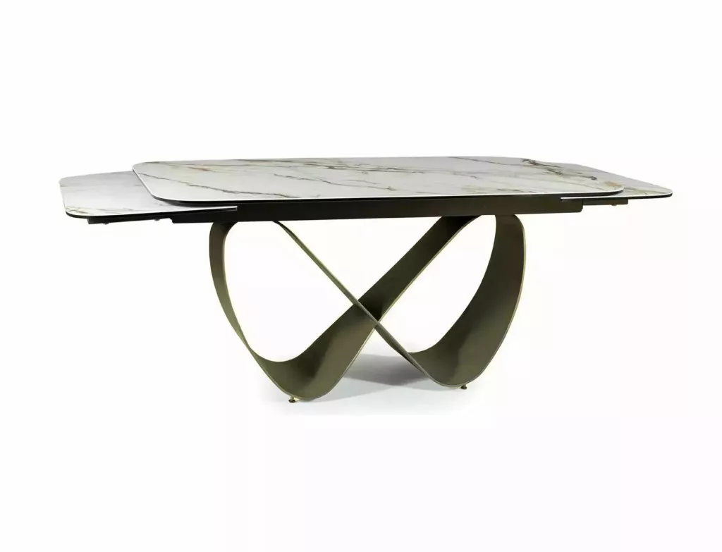 Meghosszabbítható asztal, teteje: edzett üveg + spanyol kerámia, AMBER BIANCO, váz: fém, szín: fehér / réz.