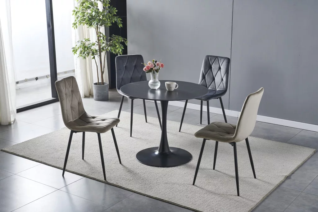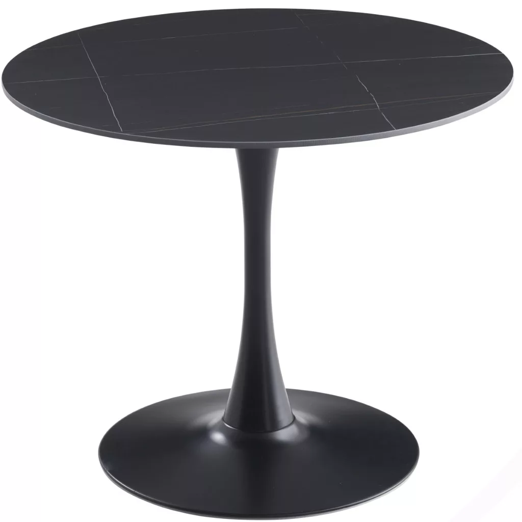 Kerek alakú étkezőasztal, gyönyörű fekete márvány színben. Az asztallap 1,2 cm vastag, 90 cm átmérőjű, és szinterezett kőből készült, Lauren színű márvány mintával. A szinterezett kő több különböző színű természetes kő kombinációjából készül, és számos előnnyel rendelkezik a hagyományos kerámiával szemben. Erősebb, mint a monoblokk kerámialapok, és nem olyan könnyen törik. Természetesen vízálló a természetes gránitlapokhoz képest, és környezetbarátabb, mint a kémiailag kezelt kvarclapok.Az asztallap egy fémoszlopon áll, fekete színben, amely illeszkedik az asztallaphoz. Az asztal maximális teherbírása 120 kg.