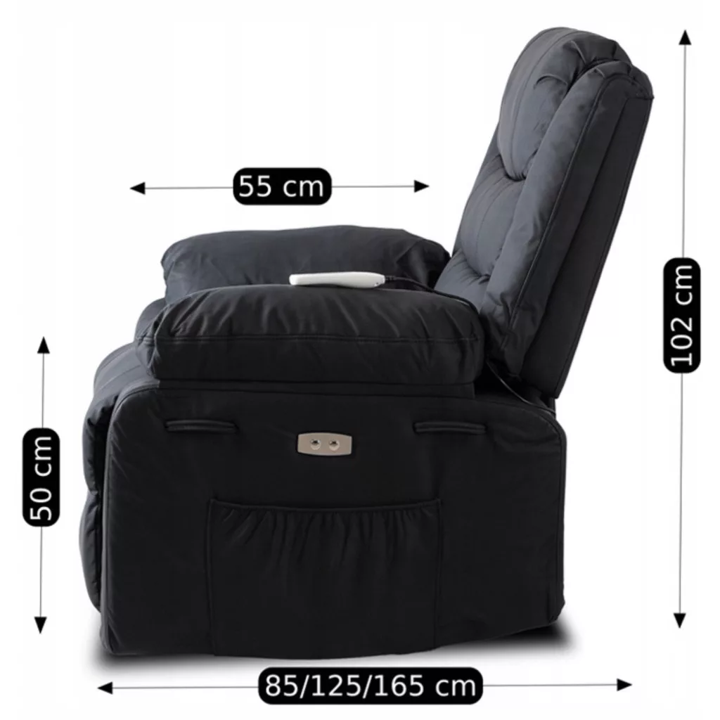 JASPER Fekete Műbőr Elektromos Dönthető Masszázsfotel. Elege van a hátfájásból munka után? Ólomnehéznek érzi a lábait? Vagy talán csak egy kis magányra vágyik – zaj, felelősség, zavaró tényezők nélkül? A Jasper fekete műbőr masszázsfotelt pontosan erre tervezték. Egy gomb – és az egész világ elcsendesedik. Lazítson, ahogy szeretne. A Jasper alkalmazkodik Önhöz, nem fordítva. Ön dönti el, hogyan szeretne ellazulni: felemelt lábtartóval – kényelmesen és szabadon, amikor tévét szeretne nézni vagy olvasni anélkül, hogy megerőltetné a lábait, vagy fekvő helyzetben – amikor a teste szunyókálásra vagy egy pihentető masszázsra vágyik munka után.