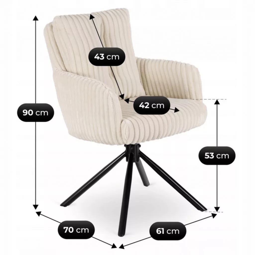 June Cream Corduroy forgószék egy elegáns, krémszínű szék, amely tökéletes azok számára, akik a stílusos megjelenést a mindennapi kényelemmel szeretnék ötvözni. Puha, áramvonalas formája és kényelmes ülése örömtelivé teszi a több idő eltöltését – legyen szó akár közös étkezésekről, akár pihentető beszélgetésekről kávézás közben. Mi különbözteti meg ezt a modellt? Magas ülési kényelem – az ülés vastag, megerősített habréteggel van kitöltve, így biztosítva a kényelmet még hosszabb használat során is. 360°-os forgatási funkció – a teljes mozgásszabadság növeli a szék funkcionalitását az asztalnál, íróasztalnál vagy tárgyalókban. Alaphelyzet-memória mechanizmus – felállás után az ülőke automatikusan visszatér eredeti helyzetébe. A kellemes kárpitozás – a kordbársony szövet puha tapintású, tartós és ellenáll a mindennapi használatnak, míg a világos, krémszínű könnyedséget kölcsönöz a belső térnek, és könnyen illeszkedik a különféle elrendezésekhez. Masszív konstrukció – a fekete fém lábak garantálják a tartósságot és hangsúlyozzák a bútor modern jellegét. Ideális: az étkezőben kényelmes és elegáns asztali székként, a konyhában vagy az étkezőben, vagy a nappaliban stílusos ülőhelyként. A June szék egy olyan bútordarab, amely arra csábít, hogy hosszabb ideig üldögélj – kényelmesen és stílusosan.