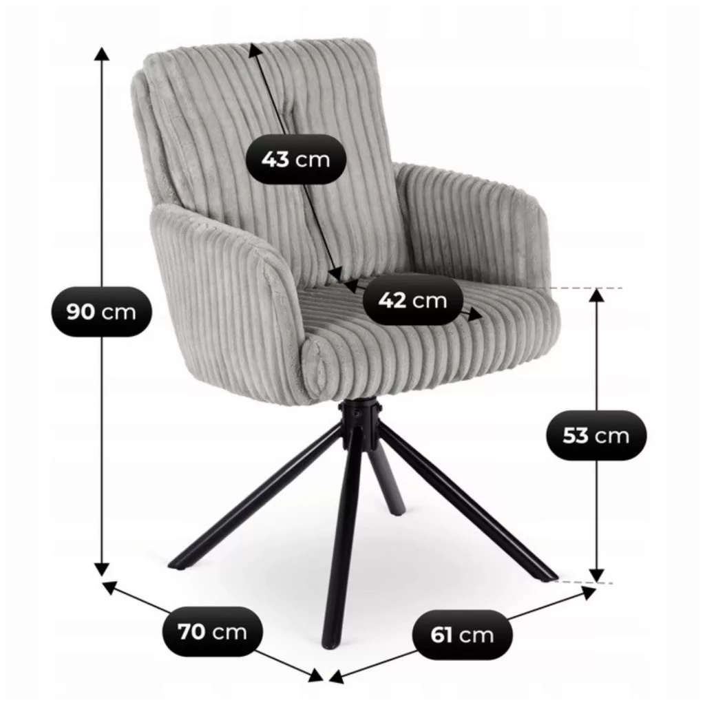 szürke June forgószék tökéletes választás azok számára, akik értékelik a stílus és a könnyedség kombinációját. A puha, körülölelő forma és a kényelmes ülés kedvet csinál egy kis időtöltéshez – akár az asztalnál, akár kávézás közben beszélgetünk. Miért válassza ezt a modellt? Magas ülési kényelem: A vastag, megerősített habbal töltött ülés hosszabb használat során is kényelmet biztosít. 360°-os forgatási funkció: A mozgásszabadság rendkívül praktikussá teszi a széket az asztalnál, íróasztalnál vagy tárgyalókban. Alapvető pozíciómemória-mechanizmus: Az elforgatás után az ülőke automatikusan visszatér eredeti helyzetébe, megőrzi a tér esztétikai megjelenését. Kellemes kárpitozás: A kordbársony anyag puha tapintású, tartós és ellenáll a mindennapi használatnak, a szürke szín pedig könnyedén illeszkedik bármilyen enteriőrbe. Stabil konstrukció: A fekete festett fém lábak tartósságot és modern jelleget garantálnak. Hová illik? Az étkezőben kényelmes és stílusos asztali székként, a konyhában vagy az étkezőben, vagy a nappaliban elegáns ülőhelyként. June szék - modern kényelem kordbársony változatban.