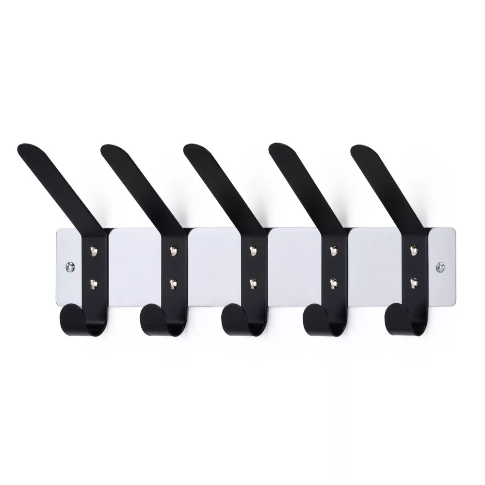 Modern fali akasztó fekete és ezüst színkombinációban. A keret rozsdamentes acélból készült. Az akasztóhorgok porfestett bevonattal rendelkeznek. Max. teherbírás 10 kg. Az akasztó már össze van szerelve.