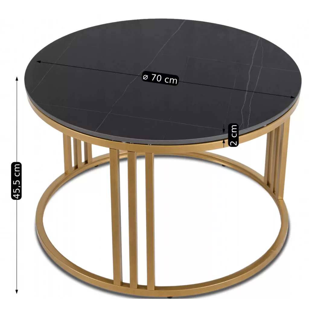 KORIN Fekete Márvány/Arany Dohányzóasztal Merjen egy csipetnyi luxust magadhoz ölelni. A Korin fekete márvány/arany dohányzóasztal azoknak készült, akik értékelik a stílust, de nem akarnak lemondani a kényelemről. A sötét kerámia teteje elegáns márványmintával mélységet és eleganciát sugároz, míg az arany keret egyedi karaktert kölcsönöz. Ez nem csupán egy újabb unalmas asztal - ez egy személyiséggel rendelkező bútordarab. Miért válassza? Kerámia teteje - tartós, karcálló és könnyen tisztítható; Fekete márványhatás - elegancia modern csavarral; Arany fém keret
