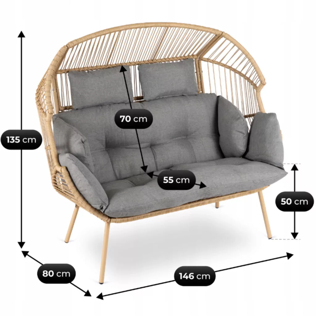 KORYNT szürke pihenőfotel tökéletes választás azok számára, akik értékelik a kényelmes kikapcsolódást egy nyugodtabb környezetben. Jellegzetes gubóformája kellemesen körülöleli a testet, kényelmes támaszt és privát, otthonos térérzetet biztosít. A puha szürke párna fokozza a kényelmet, így hosszú pihenő pillanatokat élvezhet – a kertben, a teraszon vagy a bohém stílusú nappaliban. Termékjellemzők: gubóforma – széles, körülölelő ülőfelület, amelyet két fő részére terveztek pihenésre; Stabil fémváz – szilárd és tartós alap, amely ellenáll a mindennapi használatnak; Fémvázra fonott fonás – természetes megjelenés és esztétikus kidolgozás divatos bohém stílusban;