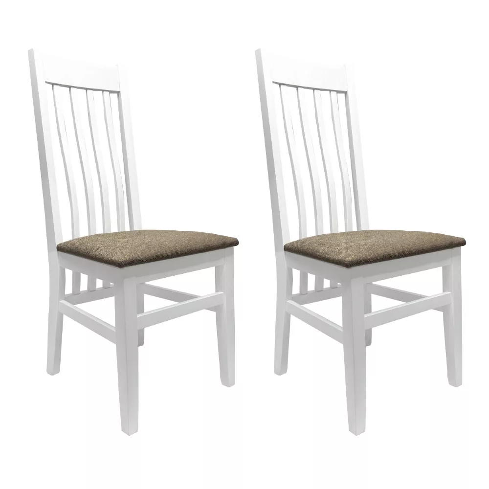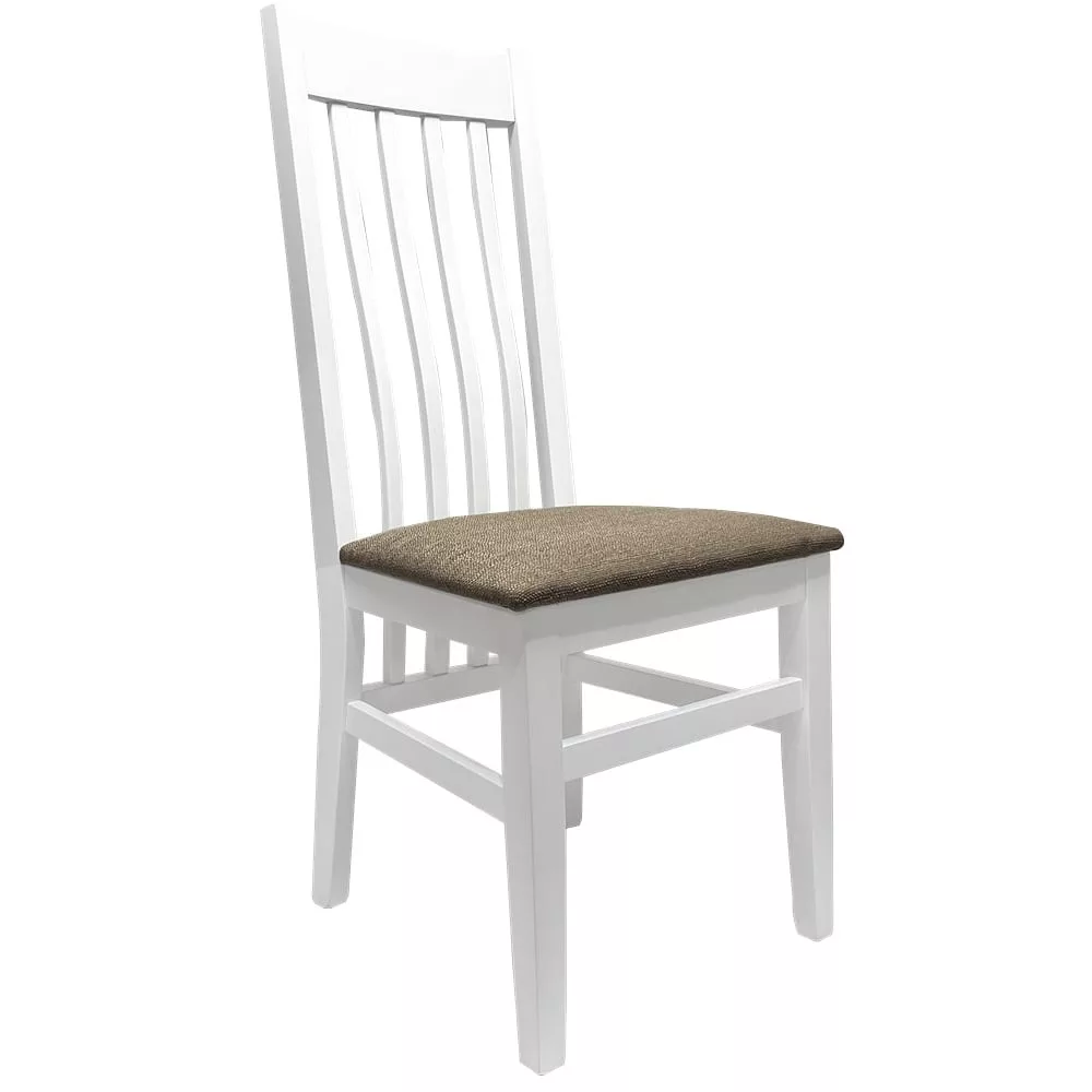 Egyszerű étkezőszék klasszikus megjelenéssel, barna vagy szürke szövet üléssel, fehér vázzal. Az ülőfelület tartós szövettel van kárpitozva a kényelmes ülés érdekében. A szék váza teljes egészében tömör fából készült. A szék lábai között minden oldalon található keresztlécek kiváló stabilitást biztosítanak. Retro megjelenésük és funkcionális kialakításuk ideális kiegészítőivé teszik ezeket a székeket a régebbi konyhai és étkezőbútoroknak.