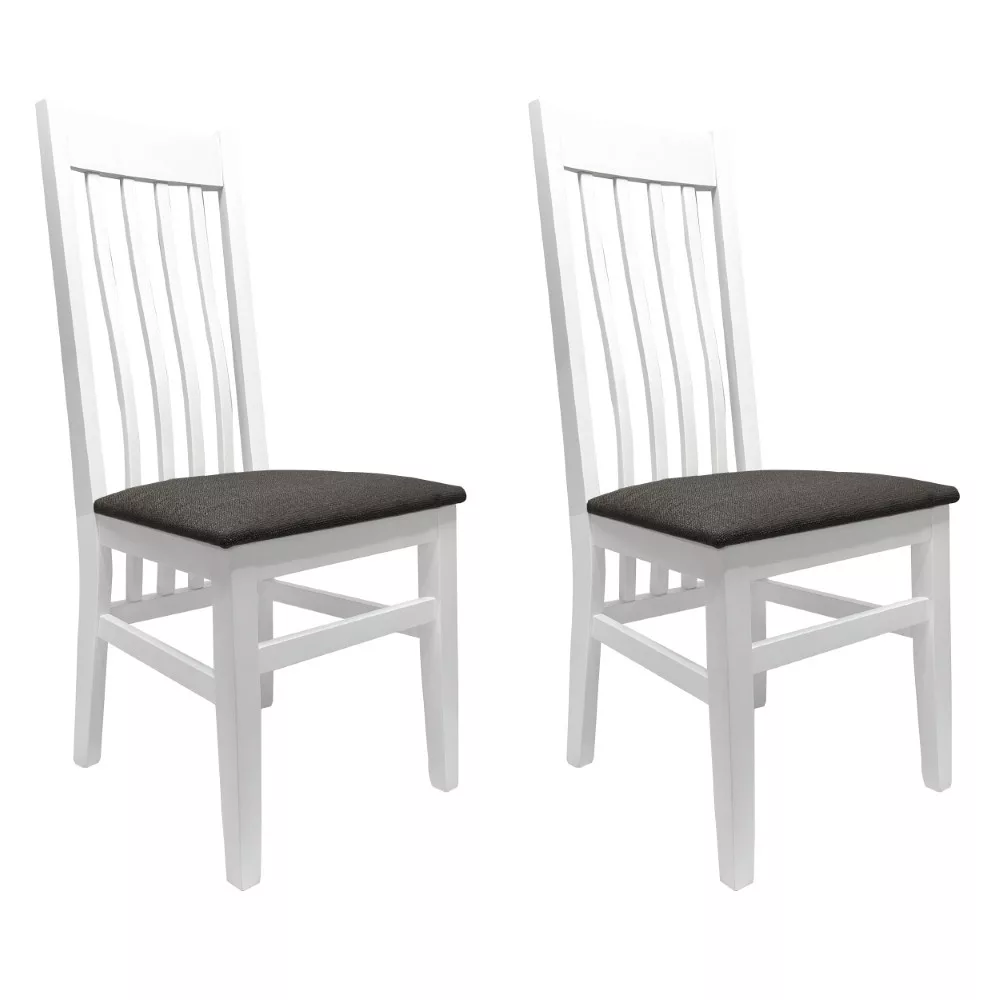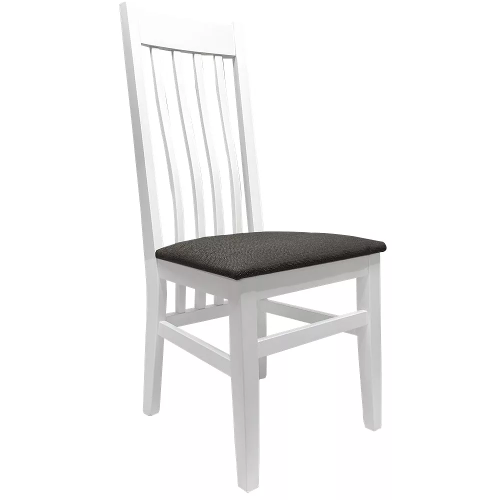 Egyszerű étkezőszék klasszikus megjelenéssel, barna vagy szürke szövet üléssel, fehér vázzal. Az ülőfelület tartós szövettel van kárpitozva a kényelmes ülés érdekében. A szék váza teljes egészében tömör fából készült. A szék lábai között minden oldalon található keresztlécek kiváló stabilitást biztosítanak. Retro megjelenésük és funkcionális kialakításuk ideális kiegészítőivé teszik ezeket a székeket a régebbi konyhai és étkezőbútoroknak.