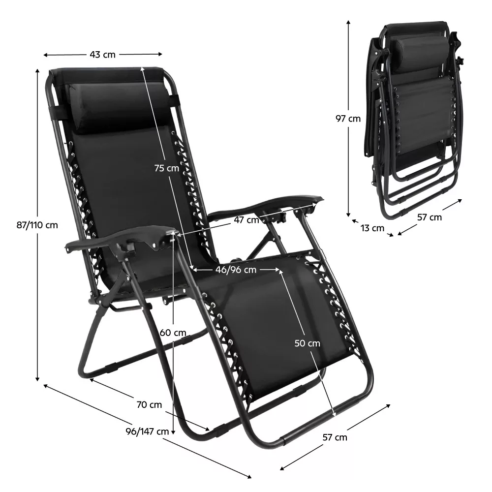 Anyag: műszövet/acél Szín: fekete Méretek (SzxMéxMa): 67x91/153x86/109 cm Méretek összecsukás után (SzxMéxMa): 67x13x96 cm Ülés magassága: 50 cm Ülés mélysége: 50/96 cm Ülés szélessége: 45,5 cm Háttámla szélessége: 53 cm Háttámla magassága: 75 cm Kartámlák magassága a talajtól: 60 cm Teherbírás: 100 kg Súly: 5,75 kg Összecsukható Állítható 5 pozícióban állítható Puha fejtámla Praktikus Modern dizájn Egészben szállítva