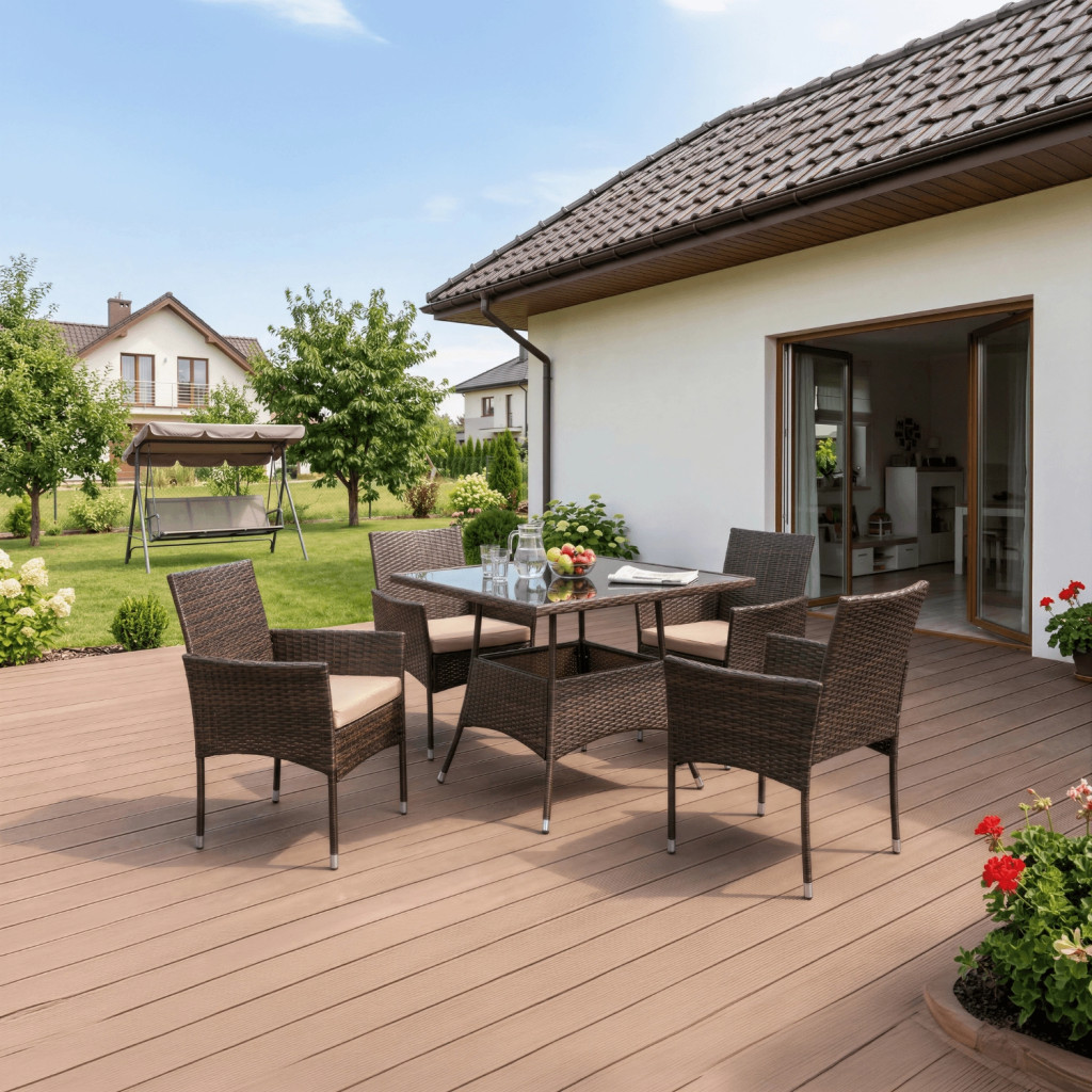 A MORADO kerti bútorkészlet egy négyzetes üvegasztallal és vízálló szövet kárpittal felszerelt kerti garnitúra barna és bézs színekben. A négyzetes asztallap szimmetrikus, kompakt elrendezést tesz lehetővé, ami különösen kisebb teraszokra és kerti pihenősarkokba ideális. Az üveg asztallap letisztult, vizuálisan könnyű megjelenést biztosít: átengedi a fényt, nem terheli a teret és rendkívül könnyen tisztítható. Az üveg anyag ráadásul hőálló és karcolásálló, ami étkezési alkalmaknál különösen fontos. A vízálló szövet kárpit a garnitúra egyik legfontosabb praktikus jellemzője: a szövet taszítja a vizet, ezért esős időjárás esetén is gyorsan kiszárad, és az anyag nem rothad, nem penészedik meg. Ez hosszú élettartamot és könnyű karbantartást jelent. A barna és bézs szín természetes, meleg hangulatot teremt, amely harmonizál a kert természetes zöldjével és a teraszok fa vagy kő burkolatával. A MORADO készlet azoknak a leginkább ajánlott, akik egy kicsit mediterrán, relaxált hangulatú kerti teret szeretnének. A nem bővíthető asztallap rögzített méretű, ami az asztal végleges, stabil kialakítását jelenti. Ha a terasz mérete adott és egy pontosan annak megfelelő komplett kerti garnitúrát keres, a MORADO az egyik legjobb választás.