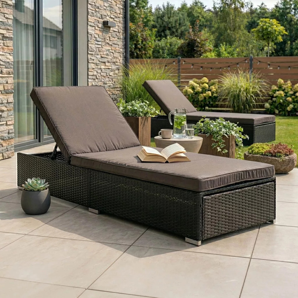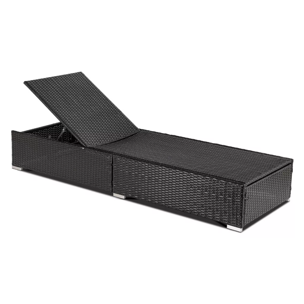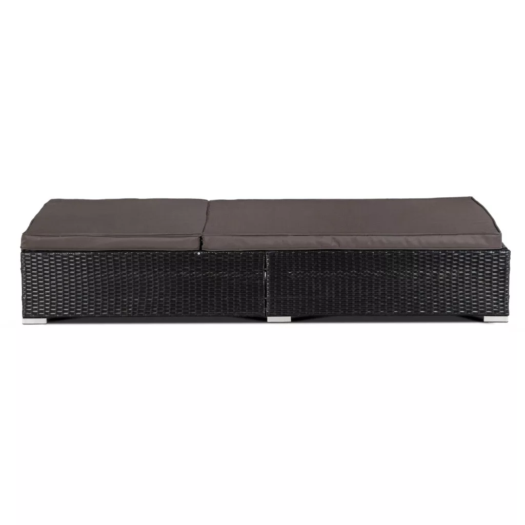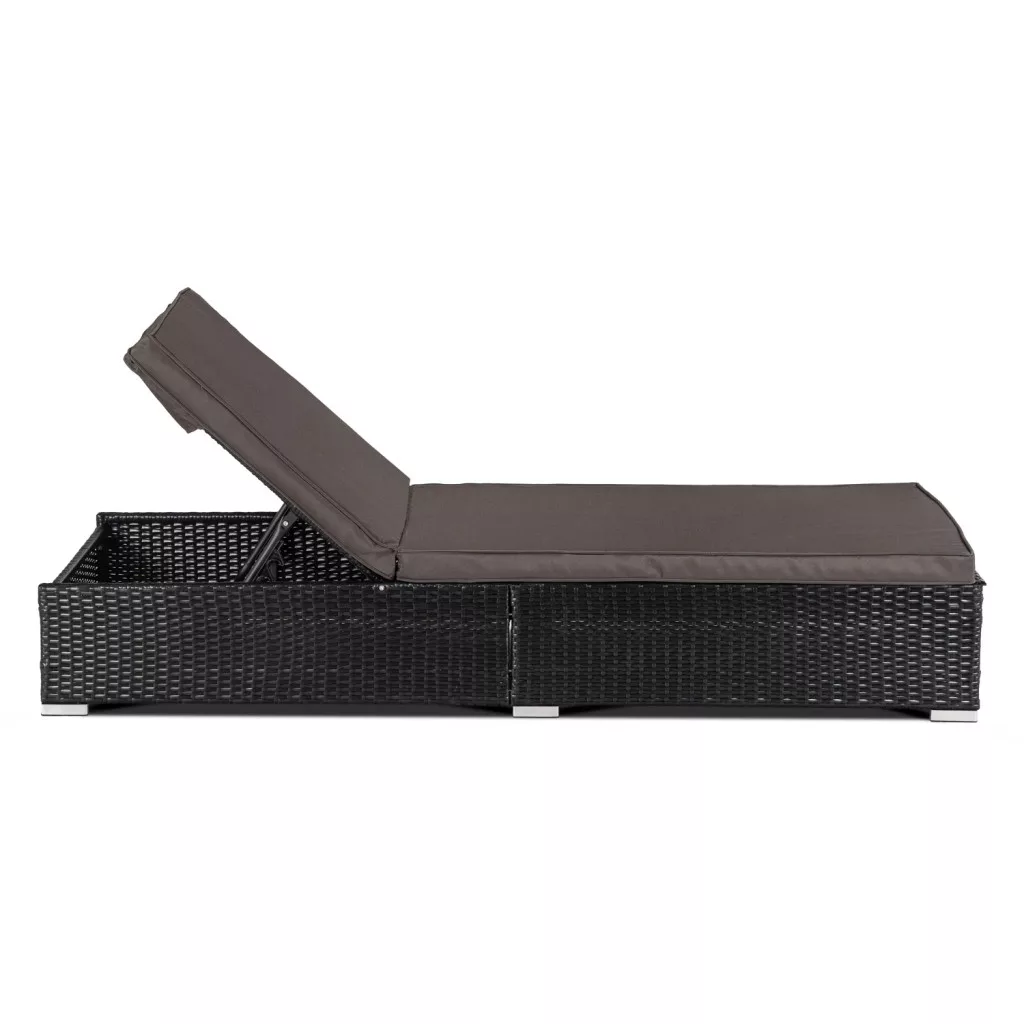 Kerti napozófotel LARGO fekete/barna szintetikus rattan. Mérete: 70×195×90 cm, ágyazható kialakítás.