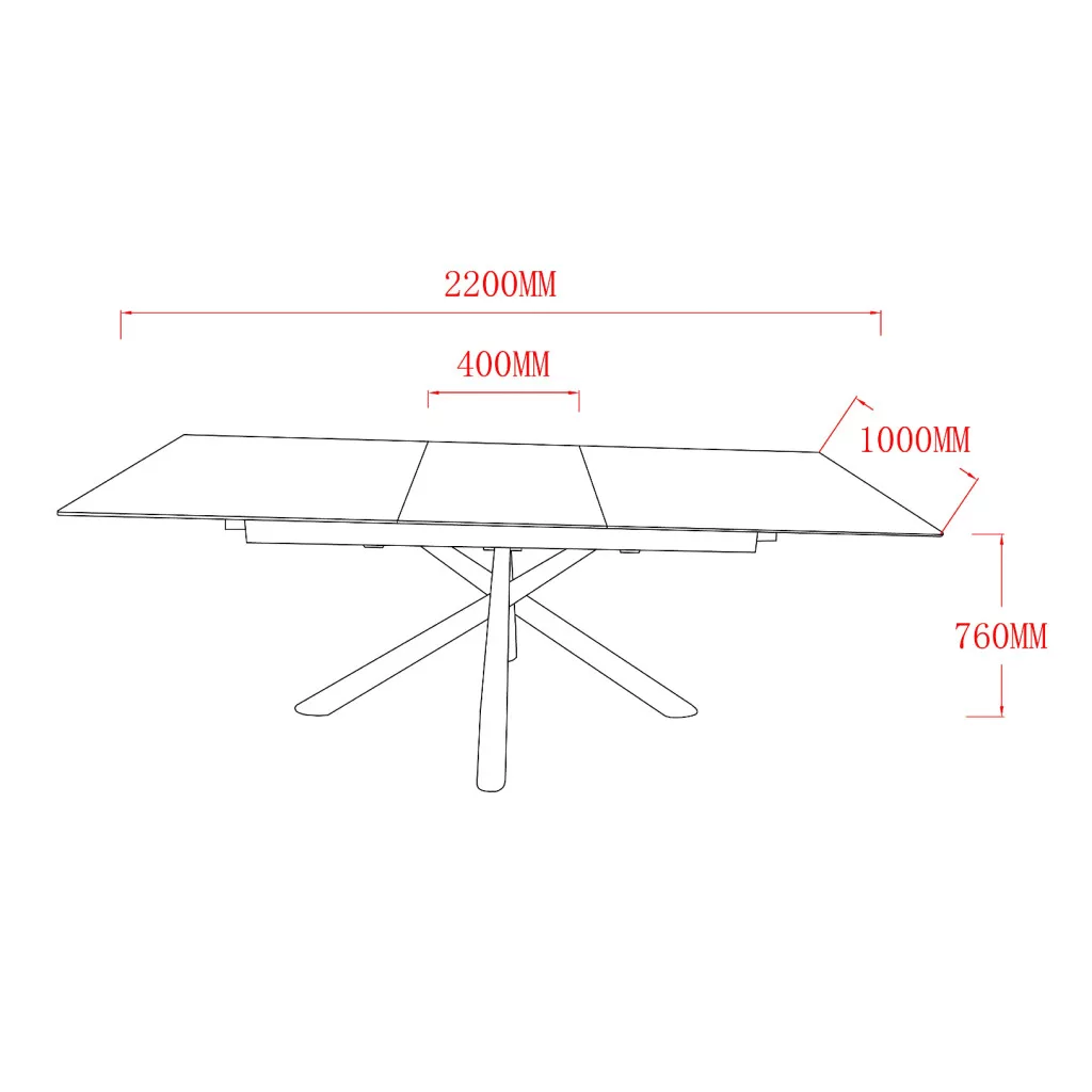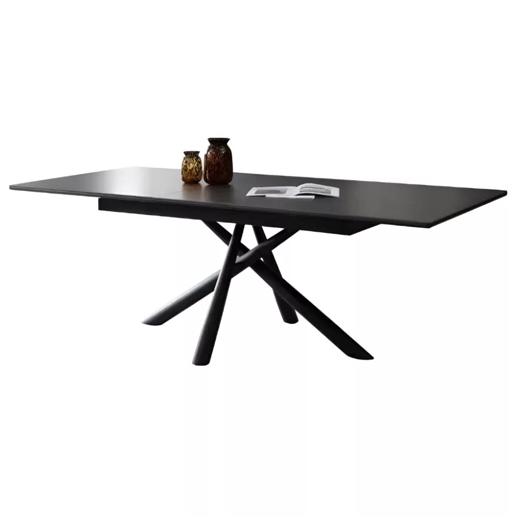 Nagy, kihúzható asztal, fekete színben kapható. 180 cm-ről 220 cm-re nyújtható egy egyszerű automatikus mechanizmussal.Az asztallap 6 mm vastag kerámia felső felülettel és MDF anyagból készült tartókerettel rendelkezik. Az asztal alapja összefonódó fémcsövekből készült, fekete porfestett bevonattal, hogy illeszkedjen az asztallaphoz és jobb védelem érdekében. Az asztal maximális teherbírása 60 kg.