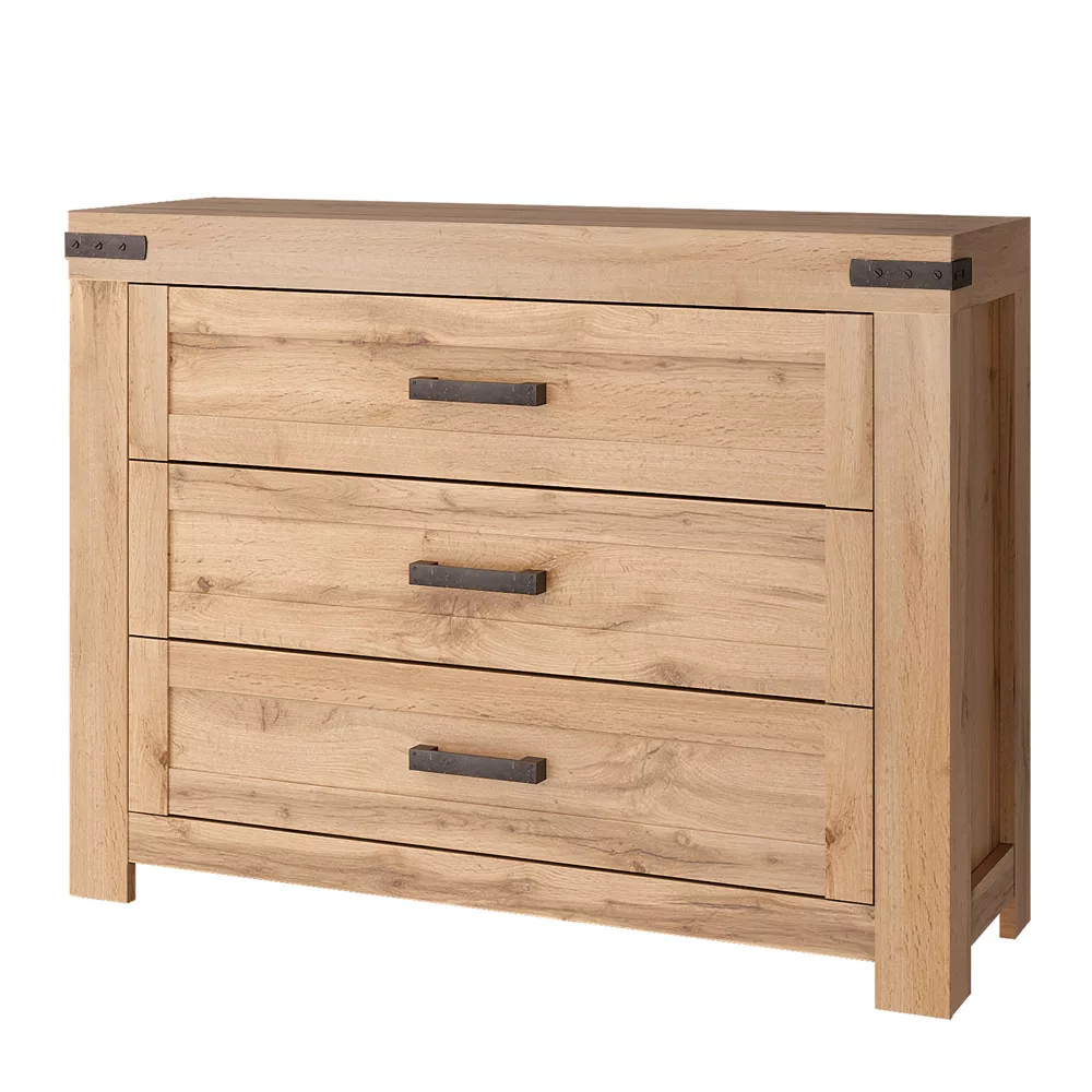 Komód MORATIZ 3S Anyag: laminált DTD/MDF/műanyag Szín: wotan tölgy Méretek (SzxMéxMa): 112,6x40,1x84 cm Lábak magassága 7 cm Anyag vastagsága: 1,6 - 2,2 cm Három fiók Fiók magassága: 21 cm Műanyag dekoráció és fogantyúk MDF ajtók Szétszerelt állapotban szállítva