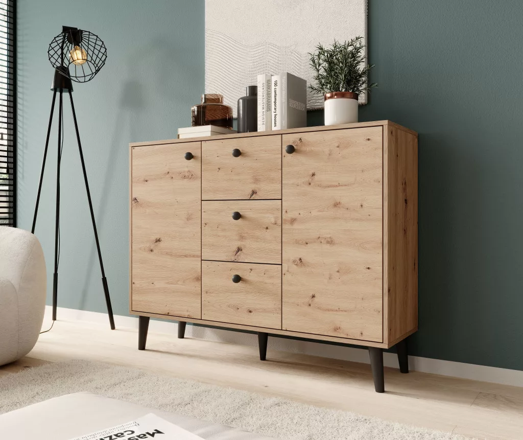 A BESA komód a minimalista design és a könnyed forma tökéletes kombinációja. A bájt a magas falábak adják hozzá, amelyeknek köszönhetően a szerkezet stabil és masszív. Három tágas fiókja lehetővé teszi, hogy kisebb tárgyakat vagy dokumentumokat rejtsen el, míg két oldalsó szekrény, középen polccal, további helyet biztosít. A BESA komód tökéletes lesz nappalijába, hálószobájába vagy előszobájába.