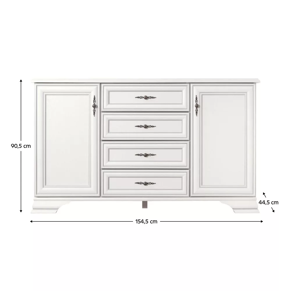 Anyag: laminált DTD Szín: alpesi fehér Méretek (SzxMéxMa): 154,5x44,5x90,5 cm Anyag vastagsága: 1,6 cm Fém fogantyúk Fogantyúk színe: antik ezüst Fiókok Fiók teherbírása: 3 kg Kétajtós Polcok Polc teherbírása: 4 kg Felső lap teherbírása: 15 kg Lábakon Lábak magassága: 8 cm Szétszerelve szállítva