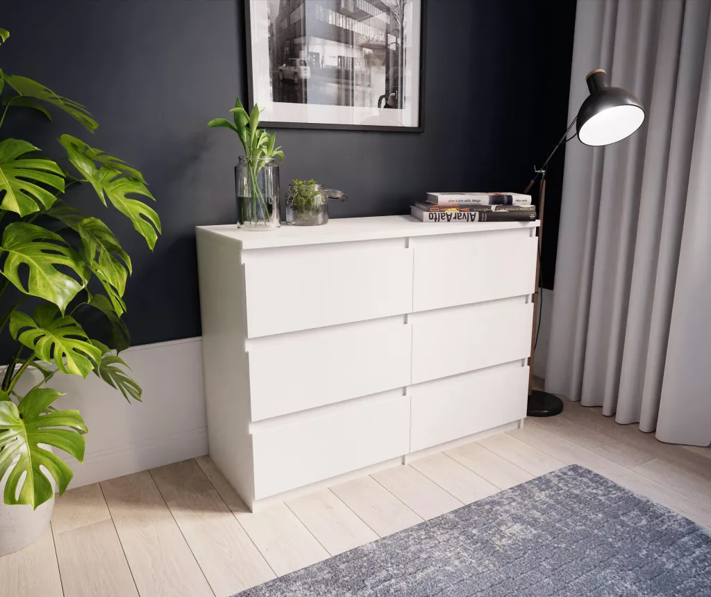 Egy nagyméretű, hatfiókos, fogantyú nélküli tálalószekrény, matt fehér vagy tölgyfautánzattal, amely a ház vagy a lakás bármely helyiségébe illik. Hat egyforma, golyóscsapágyas síneken elhelyezett fiókkal van felszerelve, amelyek elegendő helyet biztosítanak ruhák, kiegészítők vagy háztartási cikkek tárolására.
