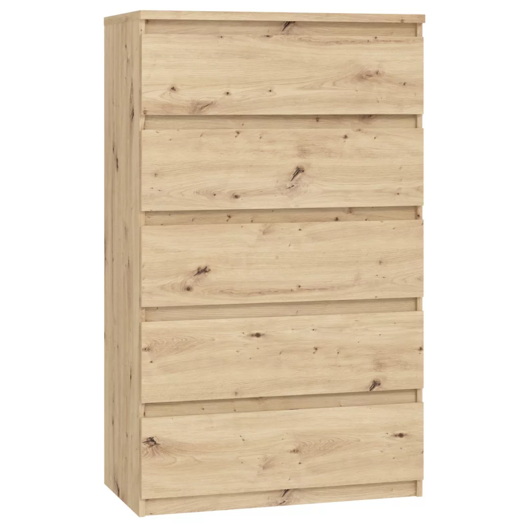 A tálalószekrény öt egyforma, golyóscsapágyas síneken futó fiókkal rendelkezik, amelyek bőséges helyet biztosítanak ruhák, kiegészítők vagy háztartási cikkek tárolására. A kompakt kialakítás nem foglal sok helyet, és könnyen elfér hálószobákban, nappalikban vagy előszobákban.