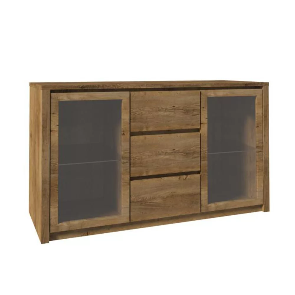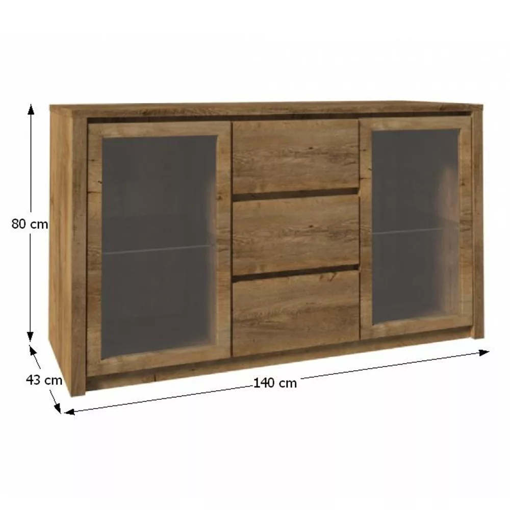 Komód dupla üvegajtós, 3- fiókos szekrény és három aljazattal, tölgyfa lefkas, MONTANA K2D