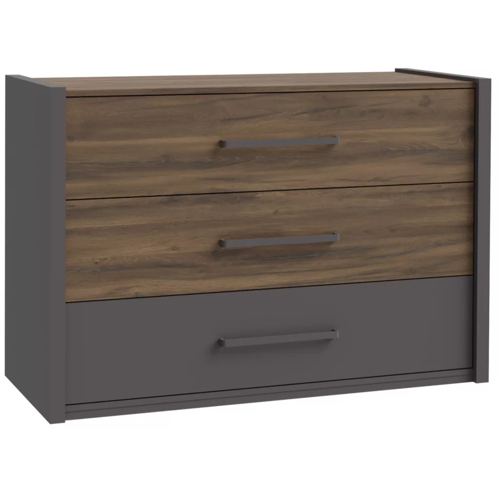 Ez a háromfiókos tálalószekrény a modern funkcionalitást sötét tölgyfa tónusokkal és matt szürke kerettel ötvözi, így funkcionális, mégis esztétikus kiegészítője lehet bármilyen térnek.