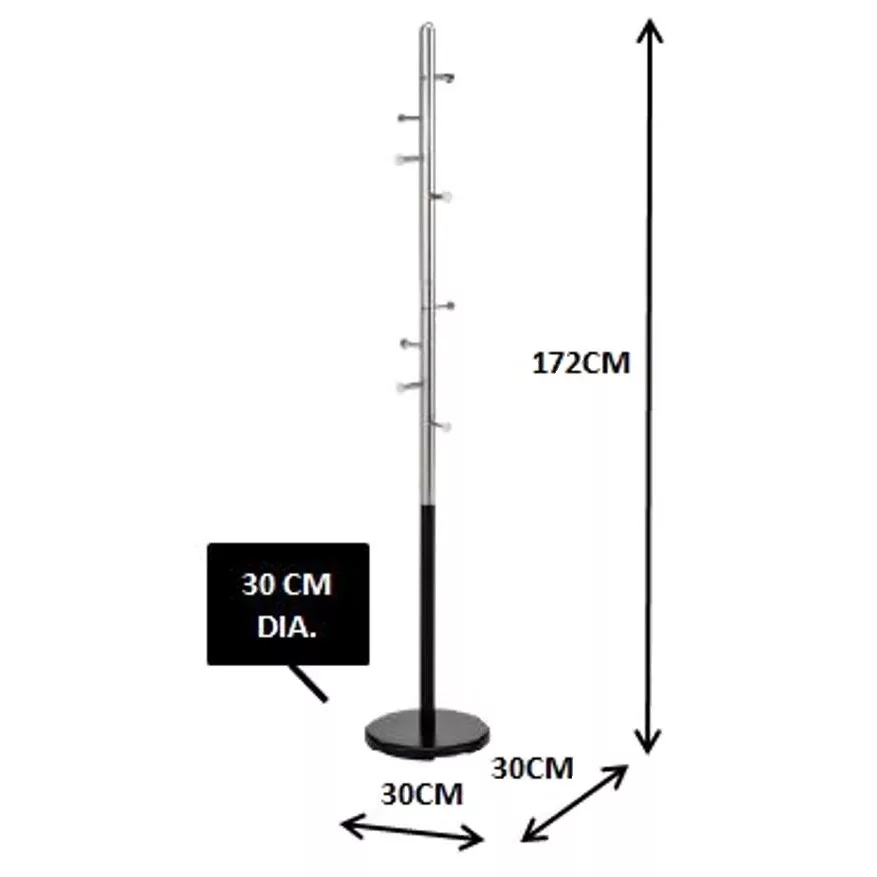 Modern vállfa kabátok, dzsekik, táskák, sapkák és egyéb ruhák, valamint kiegészítők számára. A vállfa 8 fémhoroggal rendelkezik, amelyek mindegyike akár 2 kg-ot is elbír, így együttesen akár 16 kg-os terhelést is elbír. Az akasztó acélcsőből készült, 172 cm magas, felső része krómozott, míg az oszlop alsó része és a padlólap fekete porfestett. A megerősített padlólap átmérője 30 cm, és jó stabilitást biztosít akkor is, ha az akasztó teljesen meg van terhelve.