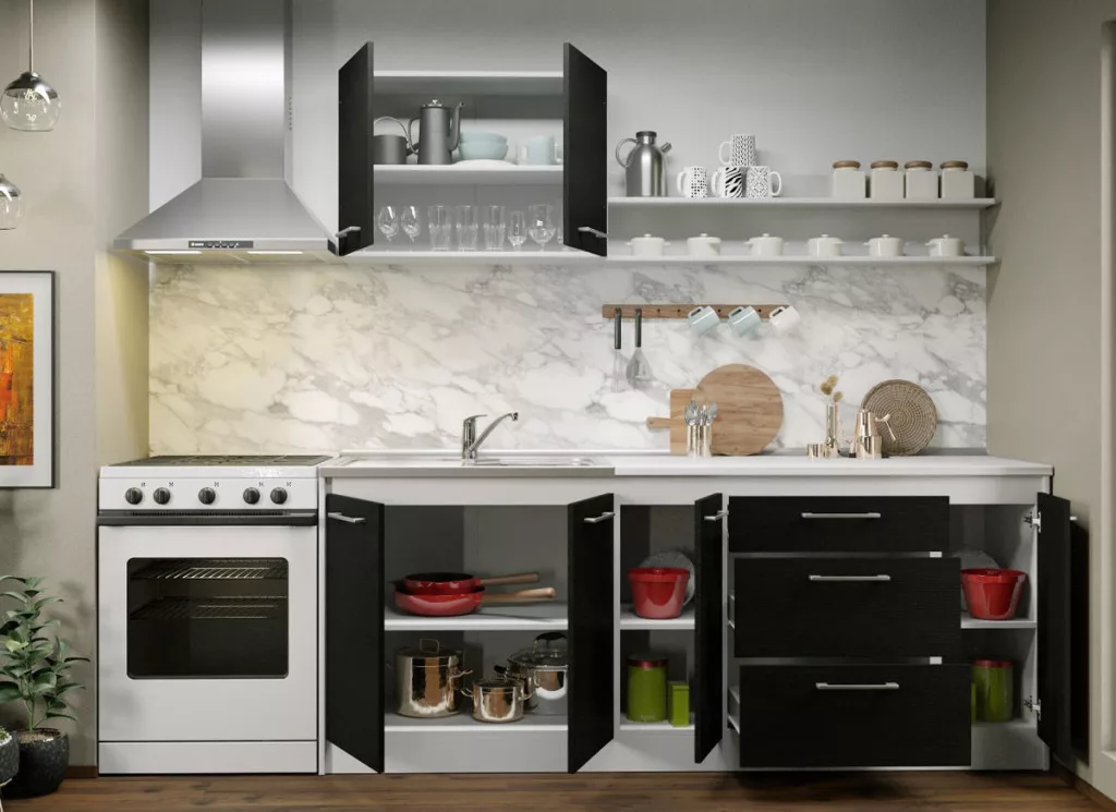 Az Noir konyhablokk alsó, felső, és magas elemei tágas tárolóhelyet biztosít a beépíthető készülékek, és a konyhai eszközök számára. Az elemek 16 mm-es préselt forgácslapból készülnek. A fehér és a ferrara kombinációja eleganciát és kifinomultságot közvetít.