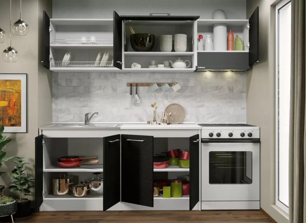 Az Noir konyhablokk alsó, felső, és magas elemei tágas tárolóhelyet biztosít a beépíthető készülékek, és a konyhai eszközök számára. Az elemek 16 mm-es préselt forgácslapból készülnek. A fehér és a ferrara kombinációja eleganciát és kifinomultságot közvetít.