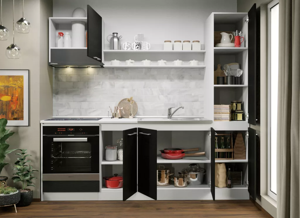 Az Noir konyhablokk alsó, felső, és magas elemei tágas tárolóhelyet biztosít a beépíthető készülékek, és a konyhai eszközök számára. Az elemek 16 mm-es préselt forgácslapból készülnek. A fehér és a ferrara kombinációja eleganciát és kifinomultságot közvetít.