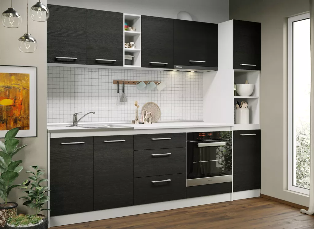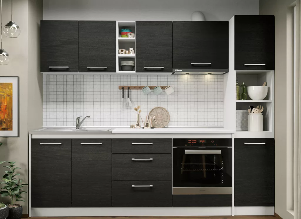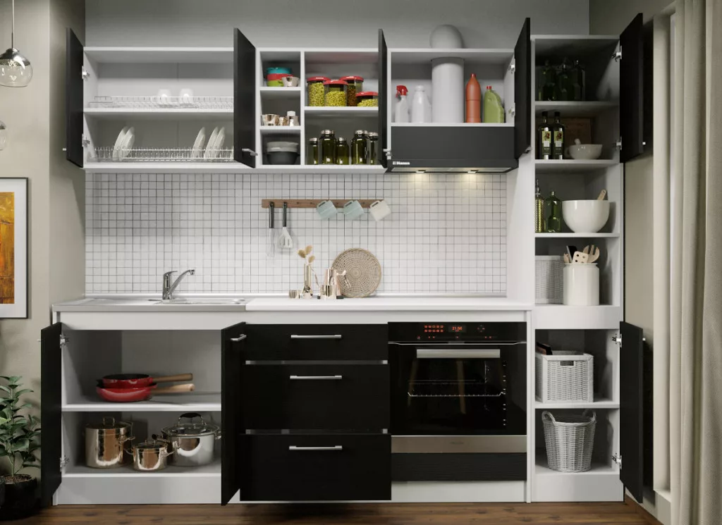 Az Noir konyhablokk alsó, felső, és magas elemei tágas tárolóhelyet biztosít a beépíthető készülékek, és a konyhai eszközök számára. Az elemek 16 mm-es préselt forgácslapból készülnek. A fehér és a ferrara kombinációja eleganciát és kifinomultságot közvetít.