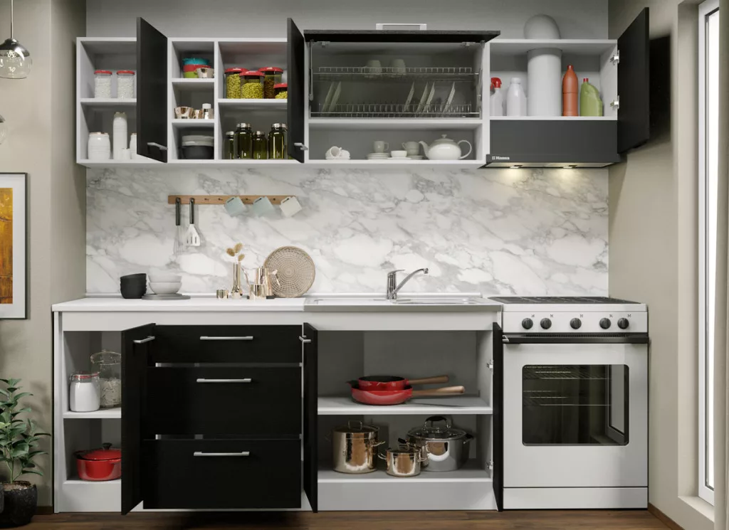 Az Noir konyhablokk alsó, felső, és magas elemei tágas tárolóhelyet biztosít a beépíthető készülékek, és a konyhai eszközök számára. Az elemek 16 mm-es préselt forgácslapból készülnek. A fehér és a ferrara kombinációja eleganciát és kifinomultságot közvetít.
