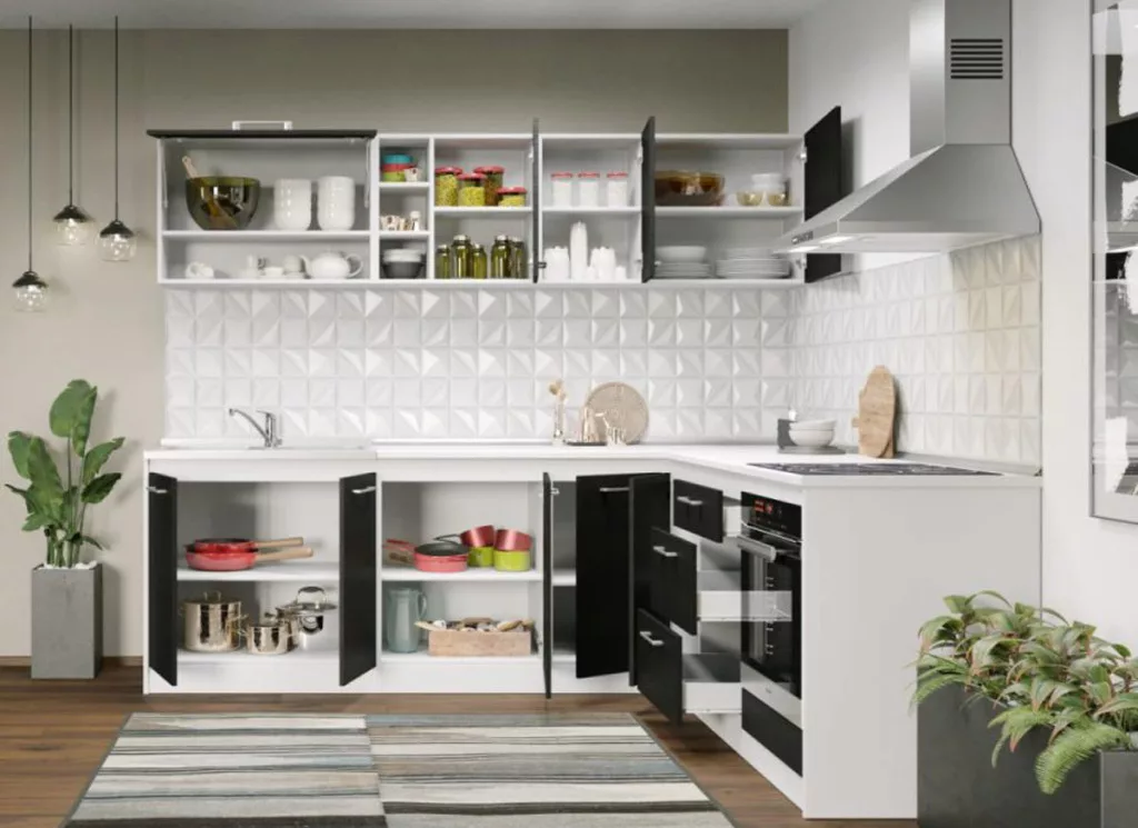 Az Noir konyhablokk alsó, felső, és magas elemei tágas tárolóhelyet biztosít a beépíthető készülékek, és a konyhai eszközök számára. Az elemek 16 mm-es préselt forgácslapból készülnek. A fehér és a ferrara kombinációja eleganciát és kifinomultságot közvetít.