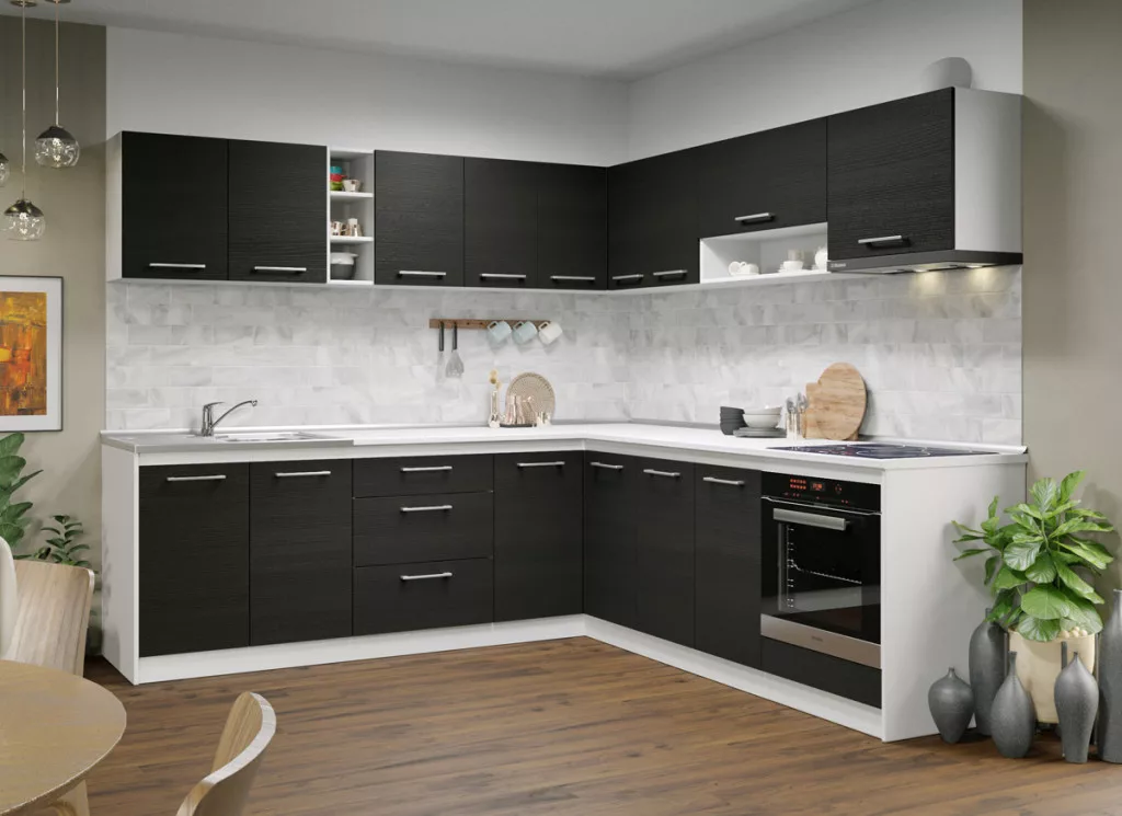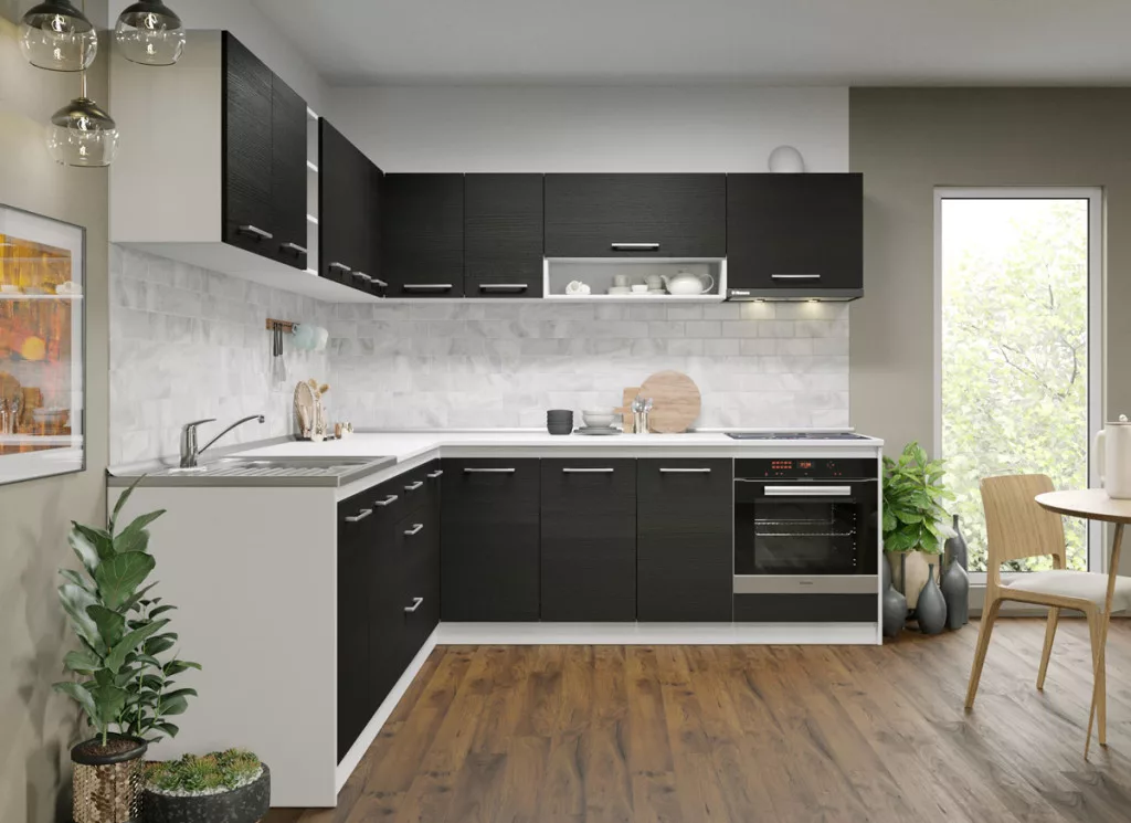 Az Noir konyhablokk alsó, felső, és magas elemei tágas tárolóhelyet biztosít a beépíthető készülékek, és a konyhai eszközök számára. Az elemek 16 mm-es préselt forgácslapból készülnek. A fehér és a ferrara kombinációja eleganciát és kifinomultságot közvetít.