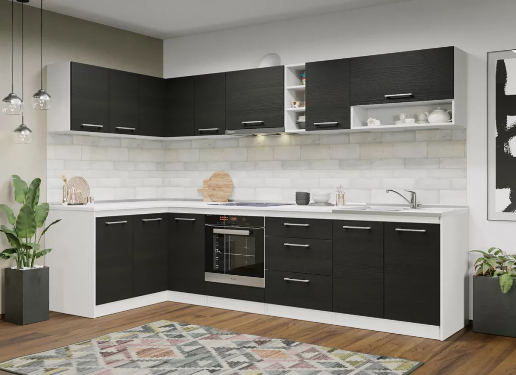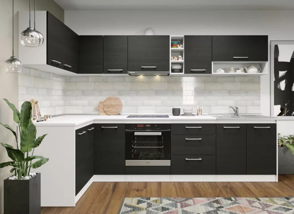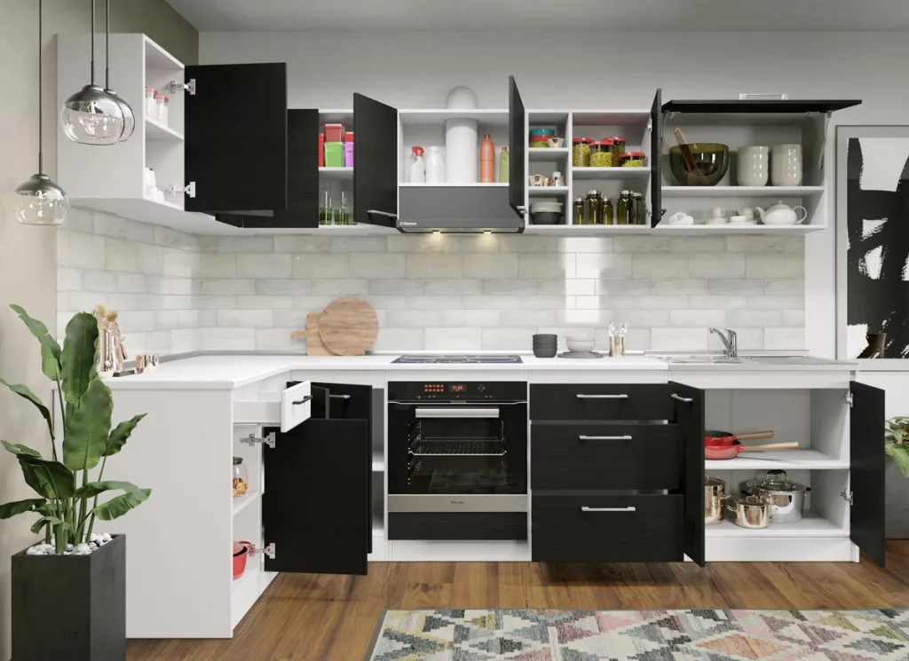Az Noir konyhablokk alsó, felső, és magas elemei tágas tárolóhelyet biztosít a beépíthető készülékek, és a konyhai eszközök számára. Az elemek 16 mm-es préselt forgácslapból készülnek. A fehér és a ferrara kombinációja eleganciát és kifinomultságot közvetít.