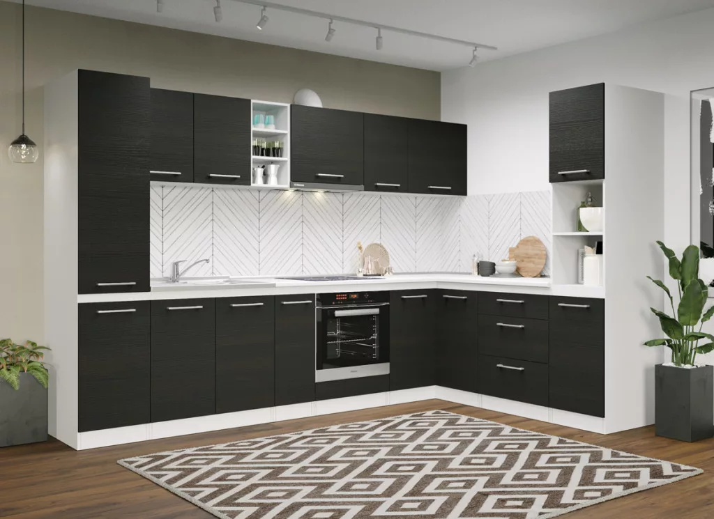 Az Noir konyhablokk alsó, felső, és magas elemei tágas tárolóhelyet biztosít a beépíthető készülékek, és a konyhai eszközök számára. Az elemek 16 mm-es préselt forgácslapból készülnek. A fehér és a ferrara kombinációja eleganciát és kifinomultságot közvetít.