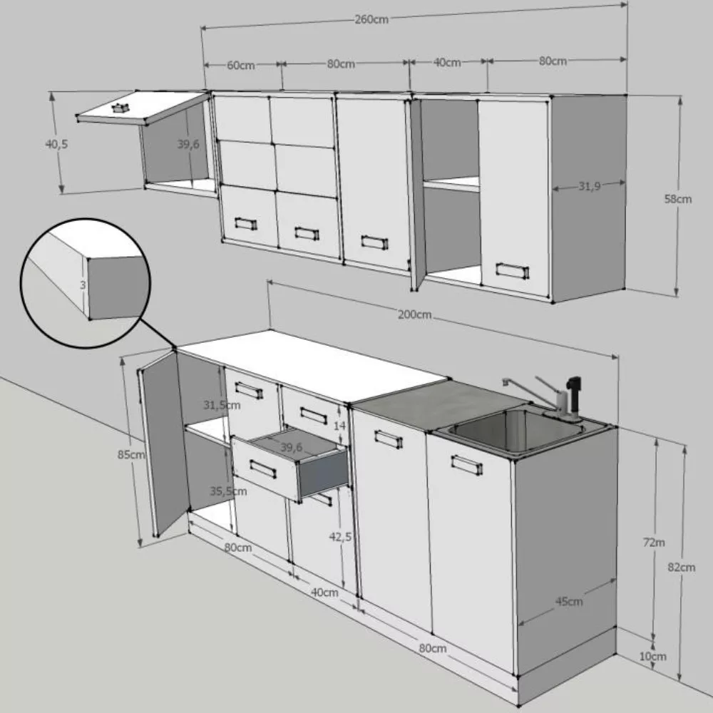 A felső szekrények szélessége a füstelszívó feletti szekrénnyel együtt: 260 cm.