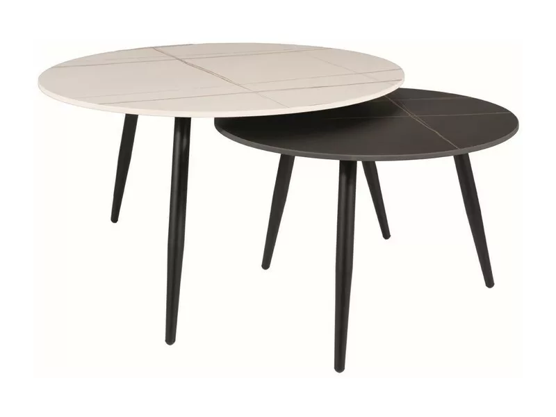 Kávézóasztal szett, asztallap: kerámia, keret: fém, szín: fehér, fekete, márványhatású / matt fekete. A kisebb asztal méretei: átmérő 60; magasság: 40cm.