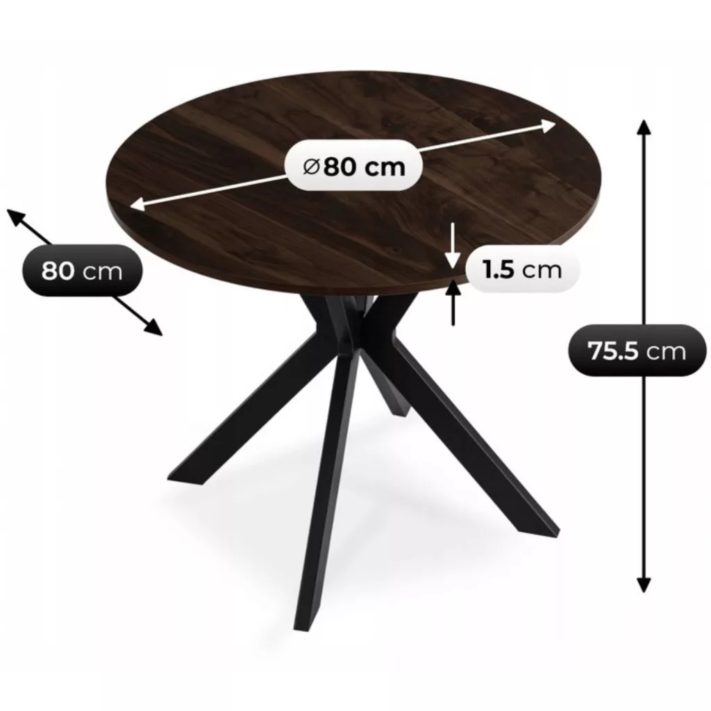 LAUREN 80 cm-es kerek asztal dió/fekete színben. Reggeli kávé útközben, egy laza vasárnapi reggeli, egy gyors vacsora munka után. Az élet itt zajlik – az asztalnál. A Lauren 80 cm egy kompakt, mégis kivételesen kényelmes asztal, amely alkalmazkodik a tempódhoz és a rendelkezésre álló térhez. A konyhában, a nappaliban, egy kis étkezőben – bárhol, ahol a kényelem, a funkcionalitás és az esztétika számít. Kicsi, de sokat tud. Nincs sok helyed? Semmi gond. 80 cm átmérőjével a Lauren asztal tökéletesen illeszkedik még egy kis belső térbe is. Könnyen találsz neki egy sarkot – nem fogja elnyomni a szobát, és pontosan azt adja, amire szükséged van: helyet egy közös étkezéshez, a laptopon való munkához vagy délutáni teához. A dió színű MDF asztallap otthonosságot és karaktert kölcsönöz a térnek. Gyönyörűen kiegészíti a fekete fém alapot, ízléses kombinációt alkotva. Ez a stílus illik mind a modern, mind a loft stílusú enteriőrökhöz. Funkcionalitás a legjavából. Tökéletes konyhákba, nappalikba, étkezőkbe, kávézókba és éttermekbe – kompakt, stílusos és kényelmes mindennapi használatra (reggelitől és kávézástól kezdve a munkán át a társasjátékokig). Tökéletes egyedülállók, párok és gyermekes családok számára (a kerek asztallapnak nincsenek élei), valamint olyan vállalkozók számára, akik tartós kialakítást és könnyű tisztíthatóságot keresnek. Válassza a Laurent mind a funkcionalitás, mind a stílus miatt.