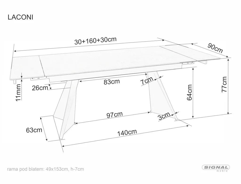 Table Laconi egy elegáns, modern étkezőasztal, amely tökéletes kiegészítője lehet otthonának. A kerámia asztallap és a matt fehér vagy fekete fém váz harmonikus kontrasztot alkot, így ideális választás étkező, konyha vagy nappali berendezéséhez. Praktikus, bővíthető kialakítása révén a Table Laconi minden alkalomra tökéletes megoldást nyújt, legyen szó családi összejövetelről vagy baráti vacsoráról.