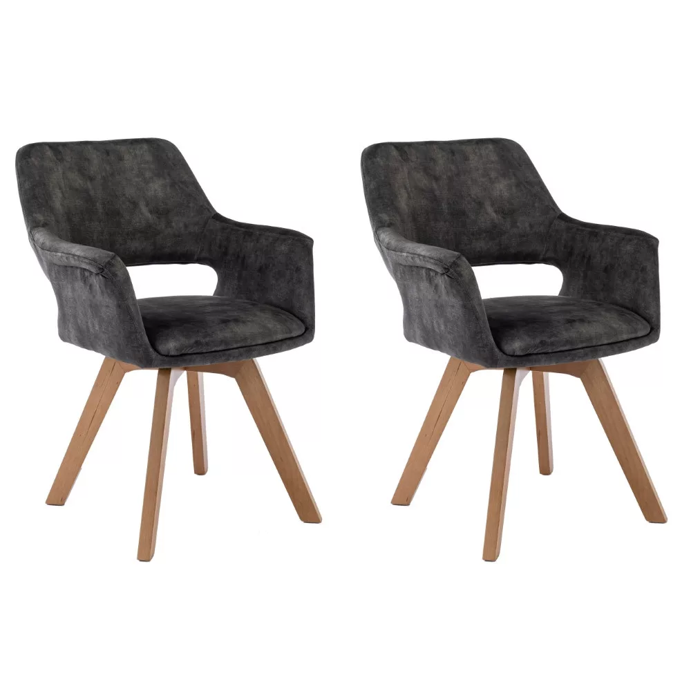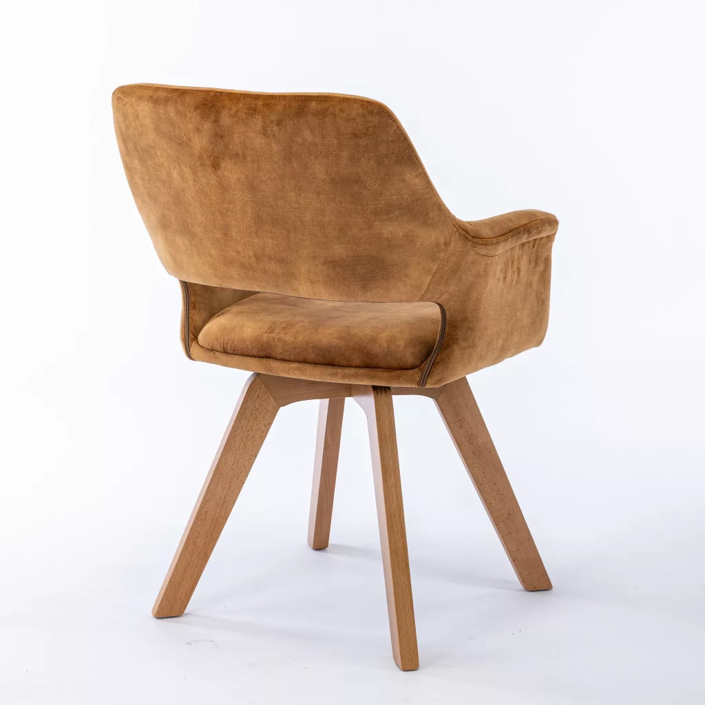 Praktikus étkezőszék karfákkal. Az ülőfelület, a háttámla és a karfák puha szövettel kárpitozottak, és több színben kapható. A szék váza és alapja tömör bükkfából készült, tölgyfa színűre festve. Az ülőfelület 44 cm széles és 41 cm mély. Magassága 45 cm. Az alap beépített forgótányérral rendelkezik, amely lehetővé teszi a szék ülőfelületének 360°-os elforgatását. Maximális teherbírás 120 kg.