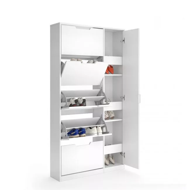 Praktikus fehér színű cipőtartó, forgácslapból. A szekrény öt fiókkal rendelkezik a cipők számára, mindegyikben elválasztó polc található, amely szükség szerint használható. A jobb oldalon levő szekrény, kívül tükörös, belül polcos.