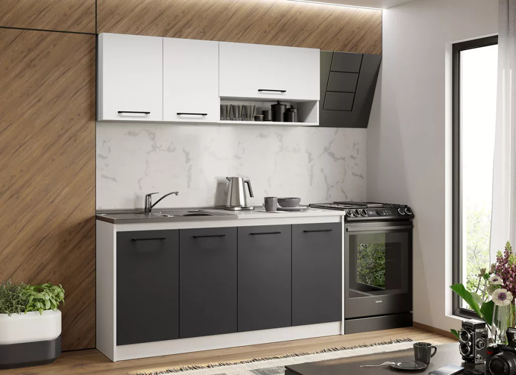 A Lorand konyhablokk alsó, felső, és magas elemei tágas tárolóhelyet biztosít a beépíthető készülékek, és a konyhai eszközök számára. Az elemek 16 mm-es préselt forgácslapból készülnek. A fehér és az antracitszürke kombinációja eleganciát és kifinomultságot közvetít.