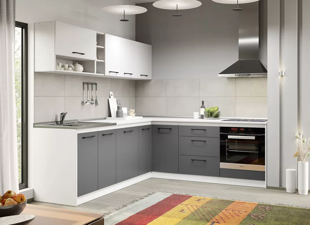 A Lorand konyhablokk alsó, felső, és magas elemei tágas tárolóhelyet biztosít a beépíthető készülékek, és a konyhai eszközök számára. Az elemek 16 mm-es préselt forgácslapból készülnek. A fehér és az antracitszürke kombinációja eleganciát és kifinomultságot közvetít.