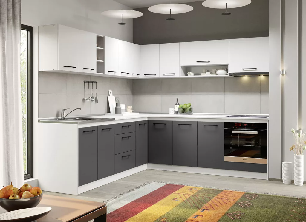 A Lorand konyhablokk alsó, felső, és magas elemei tágas tárolóhelyet biztosít a beépíthető készülékek, és a konyhai eszközök számára. Az elemek 16 mm-es préselt forgácslapból készülnek. A fehér és az antracitszürke kombinációja eleganciát és kifinomultságot közvetít.