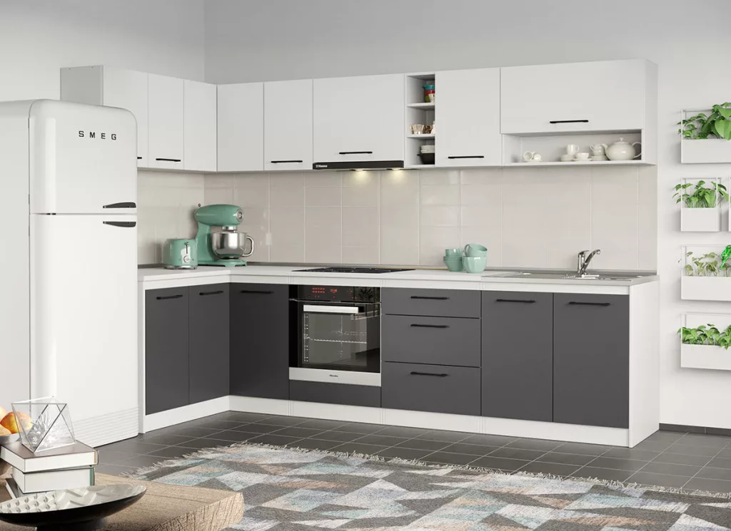 A Lorand konyhablokk alsó, felső, és magas elemei tágas tárolóhelyet biztosít a beépíthető készülékek, és a konyhai eszközök számára. Az elemek 16 mm-es préselt forgácslapból készülnek. A fehér és az antracitszürke kombinációja eleganciát és kifinomultságot közvetít.