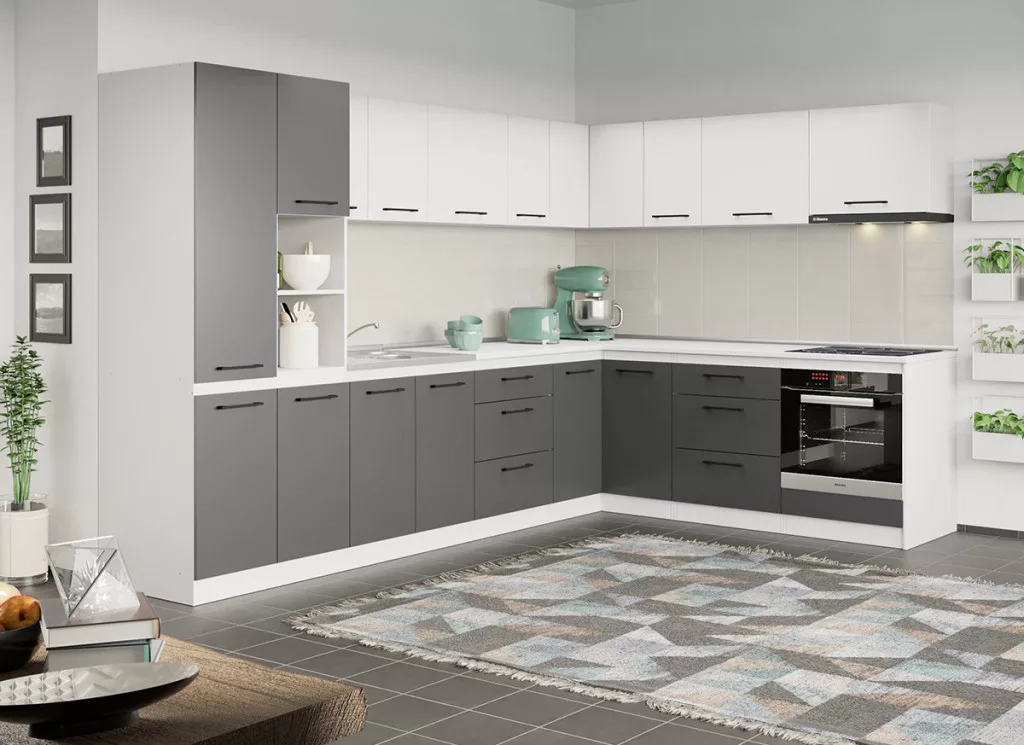 A Lorand konyhablokk alsó, felső, és magas elemei tágas tárolóhelyet biztosít a beépíthető készülékek, és a konyhai eszközök számára. Az elemek 16 mm-es préselt forgácslapból készülnek. A fehér és az antracitszürke kombinációja eleganciát és kifinomultságot közvetít.