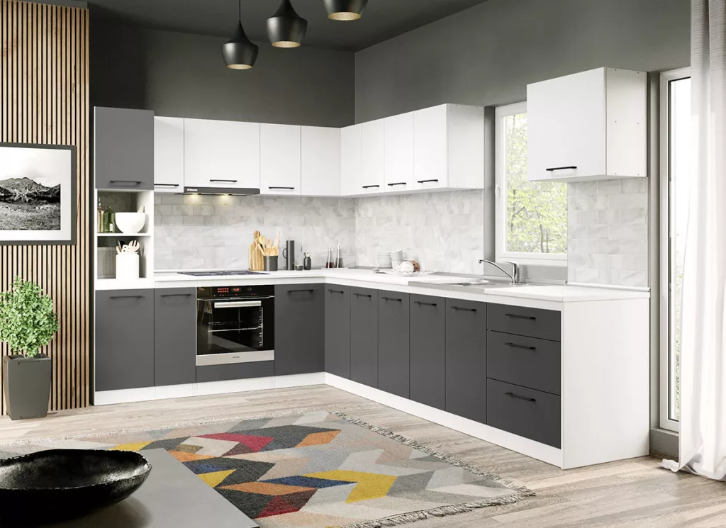 A Lorand konyhablokk alsó, felső, és magas elemei tágas tárolóhelyet biztosít a beépíthető készülékek, és a konyhai eszközök számára. Az elemek 16 mm-es préselt forgácslapból készülnek. A fehér és az antracitszürke kombinációja eleganciát és kifinomultságot közvetít.