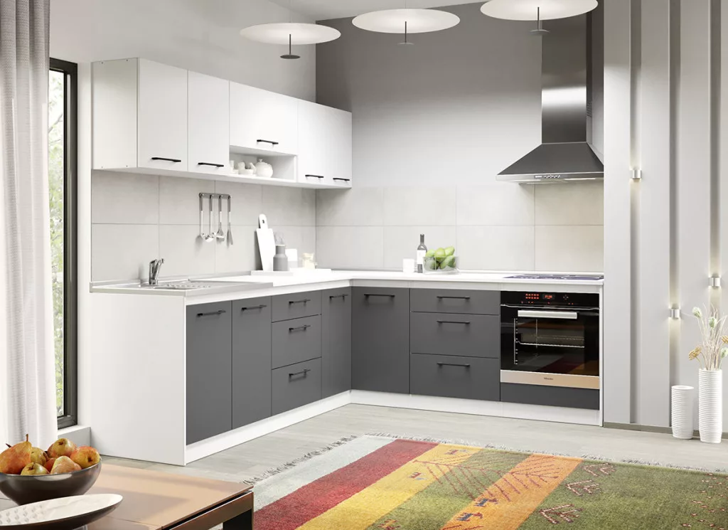 A Lorand konyhablokk alsó, felső, és magas elemei tágas tárolóhelyet biztosít a beépíthető készülékek, és a konyhai eszközök számára. Az elemek 16 mm-es préselt forgácslapból készülnek. A fehér és az antracitszürke kombinációja eleganciát és kifinomultságot közvetít.