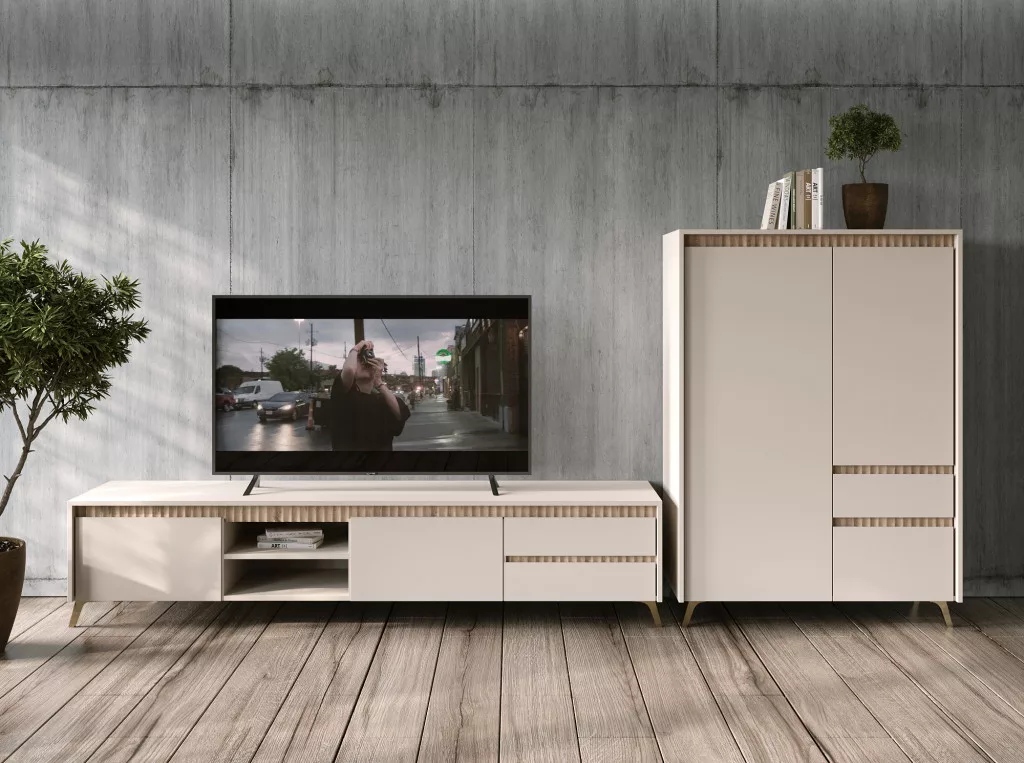 Lounge nappali termékcsaládunk 16 mm-es laminált forgácslapból és 18 mm-es MDS lécekkel készül. A bútor egyenes, szabályos vonalakat követ. Igazán modern, egyedi megjelenést kölcsönöz. A termék ogantyú nélkül kerül legyártásra, amelyek még jobban kiemelik a bútor minimalista stílusát.