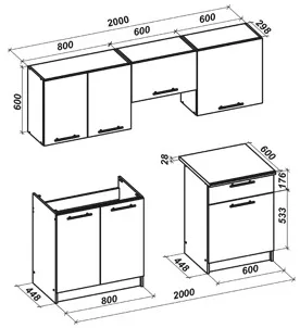 Praktikus konhyablokk minden szükséges elemmel, gázliftes ajtókkal.