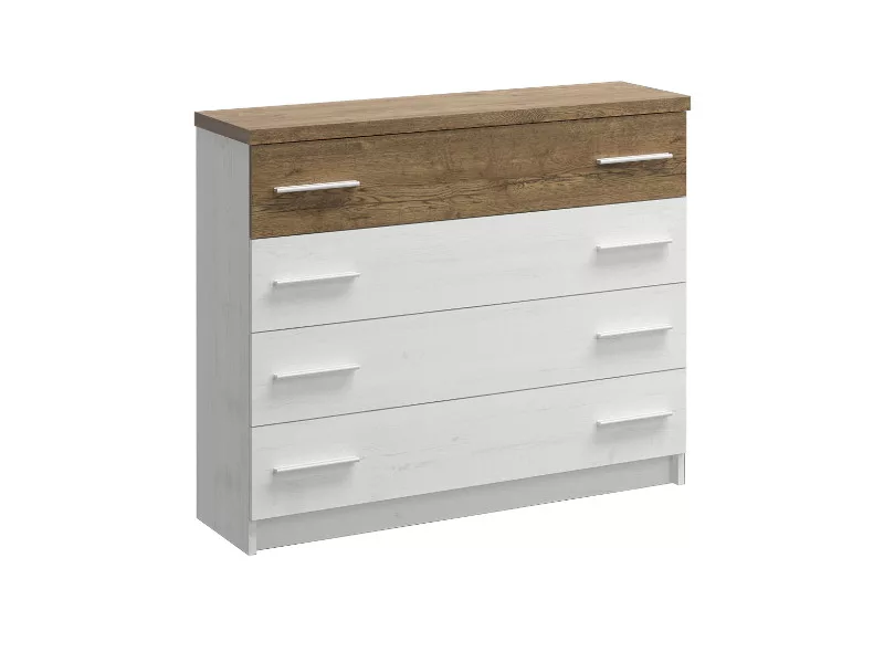 A MARKOS termékcsalád stílusos fiókos komódja, mely az anderson tölgy és a fehér színek kombinációjának, és a bútor praktikus kialakításának köszönhetően, bármelyik nappaliban megállja a helyét.